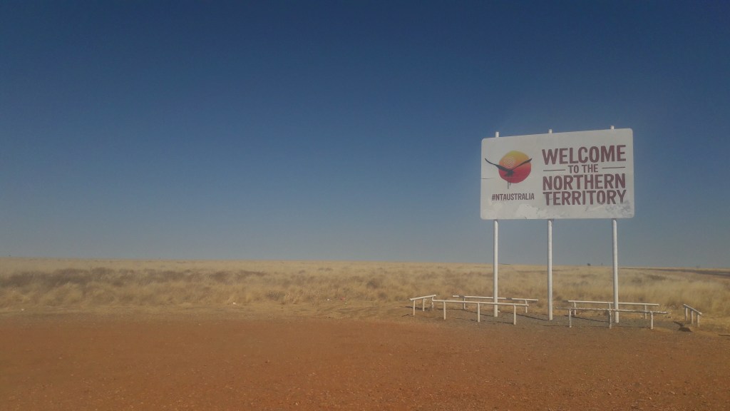 Sur un air de country, la playlist choisie par Cass pour conduire, on montait en voiture pour atteindre la frontière du Queensland et du Northern Territory qui était notre point d’échange de conducteur. On y faisait les photos d’usage devant le panneau qui indiquait le changement d’état. La partie de route qui venait était la plus redondante du parcours. Quatre heures de désert sans aucun relief, avec une végétation presque inexistante.