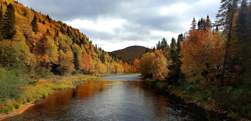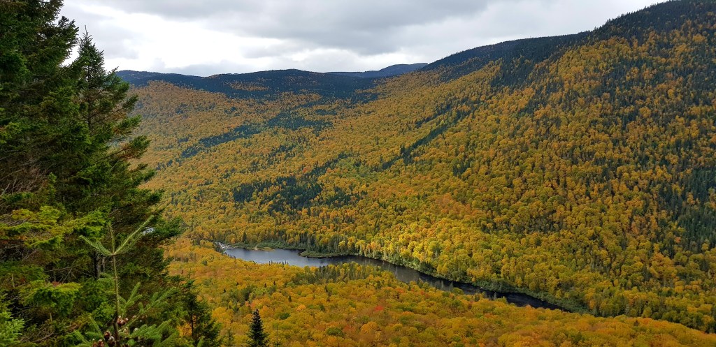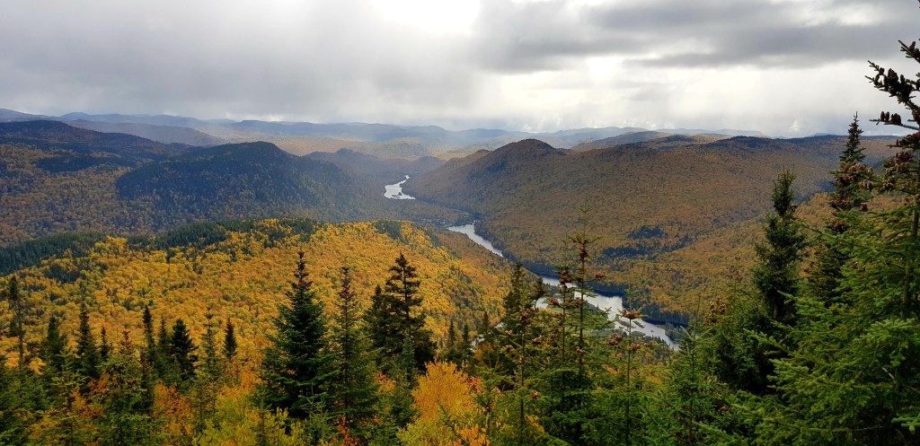 Nous étions repartis, le cœur léger, pour la deuxième partie du trajet. En prenant de l’altitude, le terrain était devenu plus boueux et la température avait baissé. Le souffle s’était fait plus court et la motivation parfois vacillante. De nombreux randonneurs nous avaient dépassés, car nous progressions prudemment, à pas de fourmis. Un kilomètre de faux-plat montant nous avait permis de nous reposer un peu avant d’attaquer la dernière partie du mont Sautauriski. Il nous avait fallu jongler avec la boue, les roches glissantes et les feuilles humides pour enfin atteindre le second belvédère, qui offrait un panorama encore plus éblouissant que le précédent. Devant nous, le confluent des rivières Jacques-Cartier et Sautauriski traçait une imposante fourche dans un horizon rempli d’arbres bariolés. Nous avions photographié cette scène sous tous les angles et pris notre déjeuner sur un banc de bois vermoulu dédié aux marcheurs éreintés.