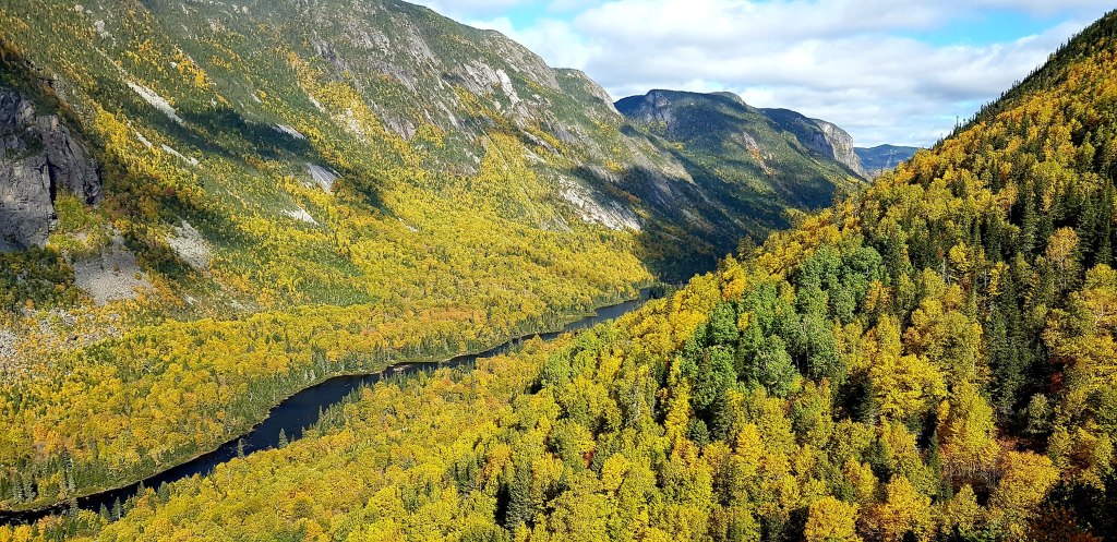 Valises bouclées : check. Petit-déjeuner englouti rapidement : check. Départ de l’Auberge des Balcons : check. L’inévitable Québécois qui collait à notre pare-choc, peu importe notre vitesse : check aussi. Sur la route menant au parc national des Hautes-Gorges de la Rivière Malbaie, un ciel d’un bleu limpide nous avait accompagnés, promettant une magnifique journée. En moins d’une heure sur une route tortueuse, nous avions atteint l’entrée du parc. Nous avions dû garer notre voiture au parking à l’entrée, car le week-end, les parcs nationaux du Québec mettaient en place un système de navettes. Elles récupéraient les visiteurs au point de départ et les déposaient à l’entrée des différents sentiers de randonnée.