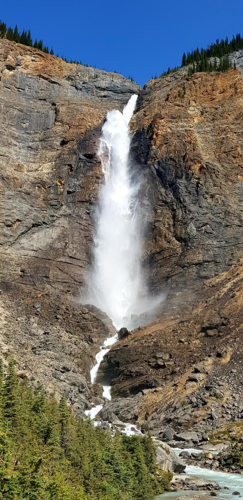 Certaines cascades épatent par leur débit, une puissance incroyable qui s’écrase sur la roche en contrebas et arrose tout autour. D’autres impressionnent par leur largeur et la sensation qu’elles donnent de pouvoir abreuver un lac à elles toutes seules. Les chutes de Takkakaw possèdent l’une de ces deux caractéristiques : étriquées à leur sommet, elles grondent dans une modeste colonne d’écume blanche dont les rebonds sont infinis et qui évoquent des dizaines de loups blancs à l’assaut d’un ennemi invisible. C’est avec cette merveille naturelle dans le dos que nous démarrons les 22 kilomètres autour de la vallée de Yoho et autour des glaciers du Iceline Trail. Lassés d’écouter de la musique pour effrayer les ours, nous sommes passés aux livres audio. Après tout, les autorités recommandent de randonner à quatre et de faire beaucoup de bruit : nous nous sommes donc dit qu’une voix qui sort de notre enceinte serait le parfait compromis pour pallier au fait que nous ne marchons qu’à deux. Il est d’ailleurs de notoriété publique qu’il faut rendre sa présence audible par tous les moyens dès lors qu’on est en forêt pour éviter un face à face inopportun avec un ours.