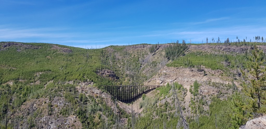 Comme le Petit Train du Nord au Québec où une ancienne ligne de train a été reconvertie en long sentier piéton et cycliste, la Colombie-Britannique a aussi son lot d’anciens aménagements ferrés. Ainsi en se baladant le long du Myra Canyon, on peut, sur douze kilomètres, ressentir le frisson de traverser d’immenses ponts ferrés en bois caractéristiques de l’architecture de l’époque. Ce week-end est un week-end prolongé au Canada en raison du Labour Day qui se célèbre le premier lundi de septembre comme chez leurs voisins américains, les cyclistes et marcheurs sont donc nombreux avec nous ce matin.