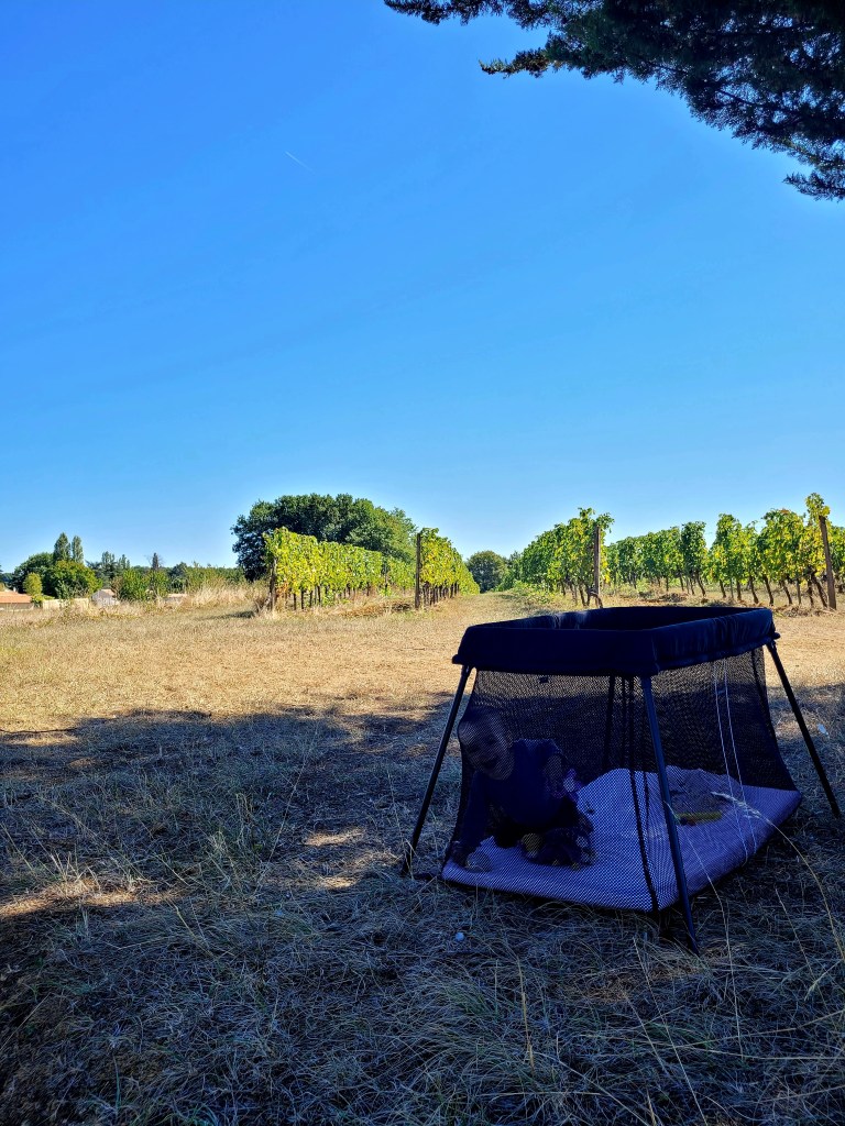 Peu importe, nous arrivons à Fontet autour de 16h et nous passons un grand portail pour arriver au Clos d’Any, une chambre d’hôtes au cadre verdoyant. Nous sommes en compagnie d’un groupe de cyclotouristes anglais. Ils sont tous retraités et ils nous avouent avoir fui l’Angleterre à cette période pour éviter les obsèques de la reine Elizabeth, qu’ils trouvent ridicule. Une fois Clémence couchée, nous mangeons et buvons ensemble au cours d’une soirée mémorable.
