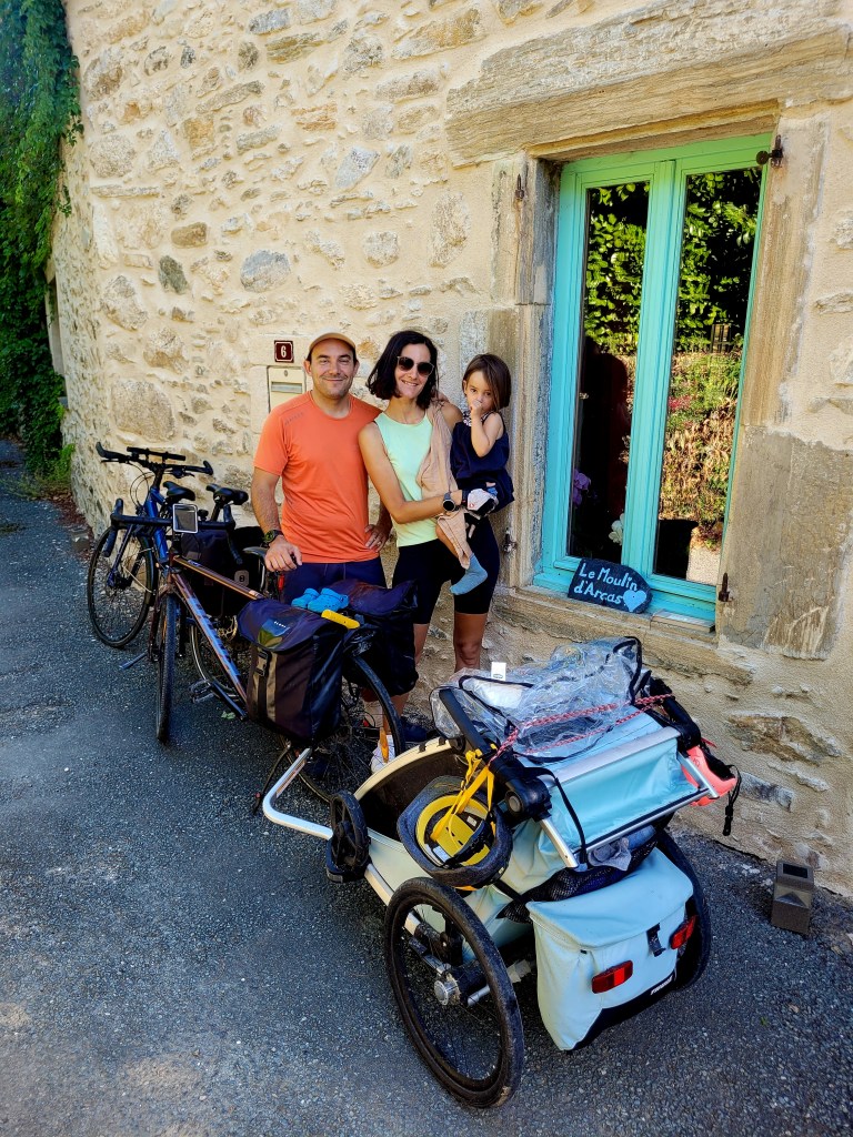 A la fin de cette discussion, la pluie s’est arrêtée et nous en profitons pour repartir rapidement afin de passer entre les gouttes. Clémence s’endort dans sa cariolle et nous filons sans traîner vers Prémian où nous logeons au Moulin d’Arcas. Elle dort encore quand nous arrivons et nous en profitons pour discuter avec les propriétaires des lieux, un couple de bitterois qui a changé de mode de vie. Ils sont vraiment adorables et après l’habituelle routine parc/douche/pyjama du début de soirée, nous passons le repas avec eux.