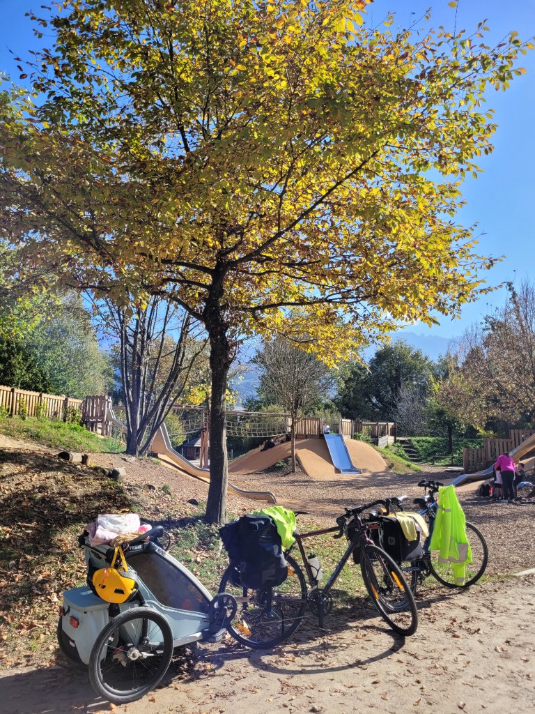 Peu après, nous arrivons au parc de la ville et nous tombons sur un paradis pour enfants. Des toboggans, des balançoires, des cordes, une tyrolienne, on ne sait plus où donner de la tête. L’endroit est très fréquenté mais l’ambiance est agréable, familiale. Il fait beau et chaud, Cassandre joue avec Clémence pendant que Stéphane s’attelle au bricolage et à la réparation de la petite selle Shotgun.