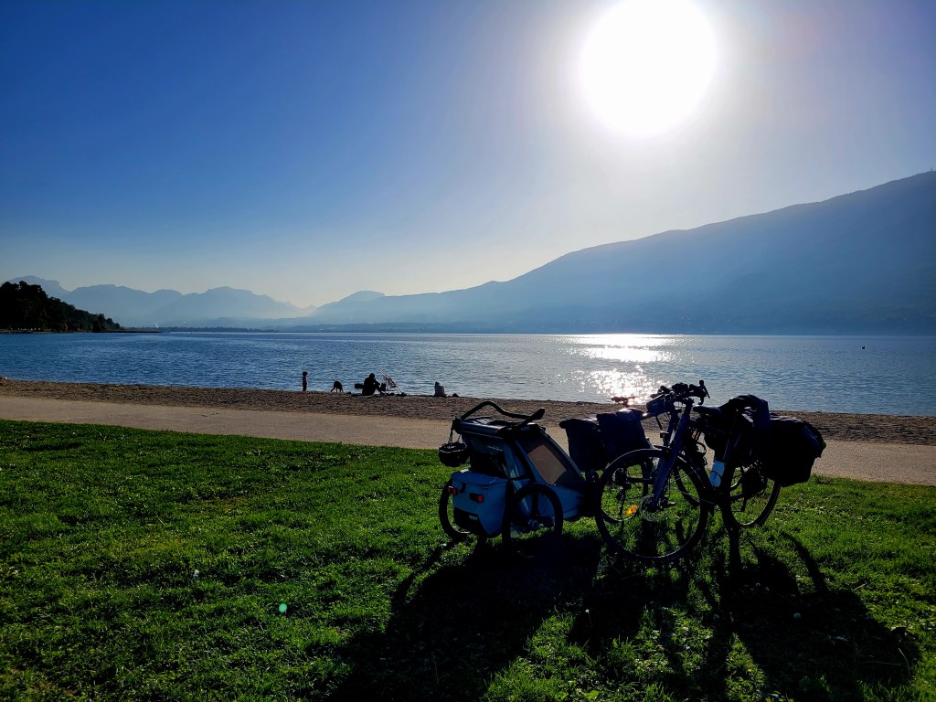 Sa sieste tardive ne nous dérange pas car nous mangeons ce soir avec une amie qui vit ici. Nous l’avions accueilli en Warmshowers l’année précédente et nous étions restés en contact. Nous passons une excellente soirée dans un petit restaurant d’Aix-les-Bains pour fêter la fin de la Belle Via !