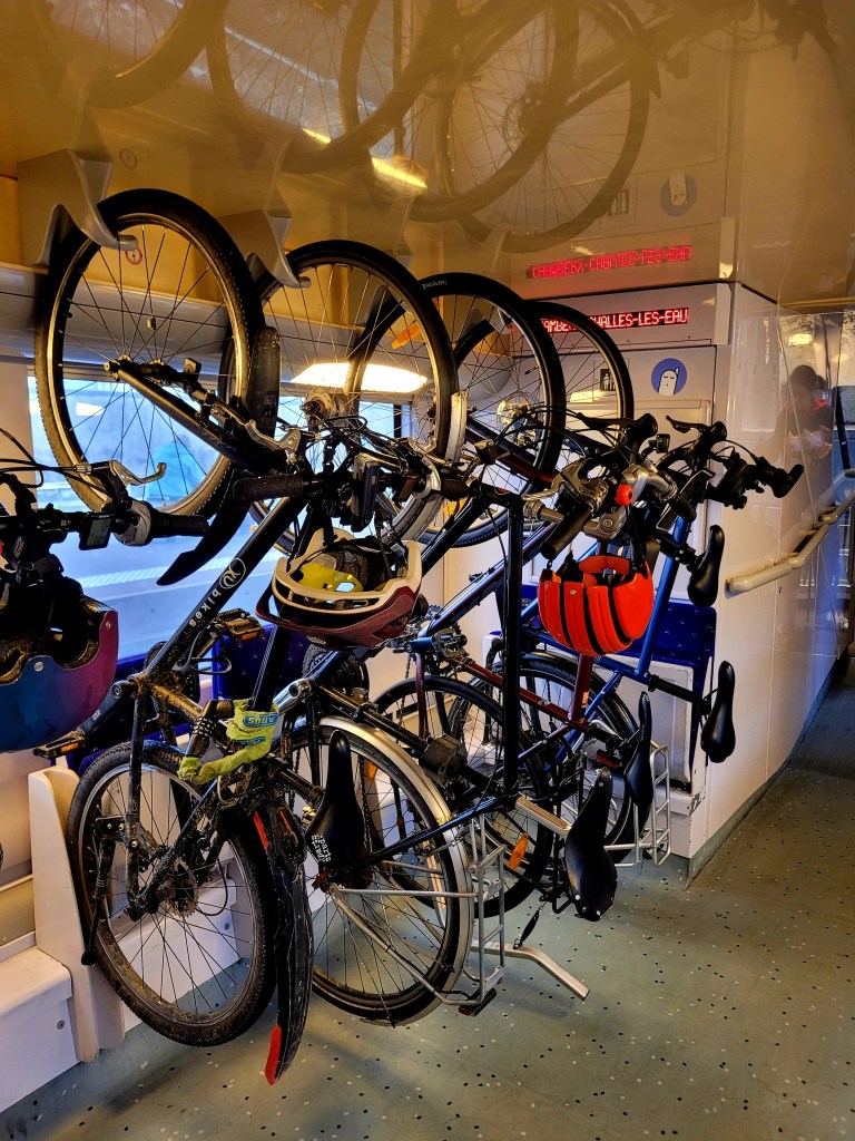 Chez nous, au départ d’Avignon, nous faisons l’amère expérience que nous sommes toujours loin du compte. Pour la SNCF, l’idée d’un wagon vélo repose sur un emplacement où l’on case péniblement deux vélos. Et quand bien même nous avons réservé les places pour nos vélos dans ce train, nous nous retrouvons à dix vélos rien que dans ce wagon. Nous en voyons encore d’autres dans les voitures adjacentes. Heureusement, nous étions arrivés en avance à la gare mais nos vélos se retrouvent donc tout derrière les autres.