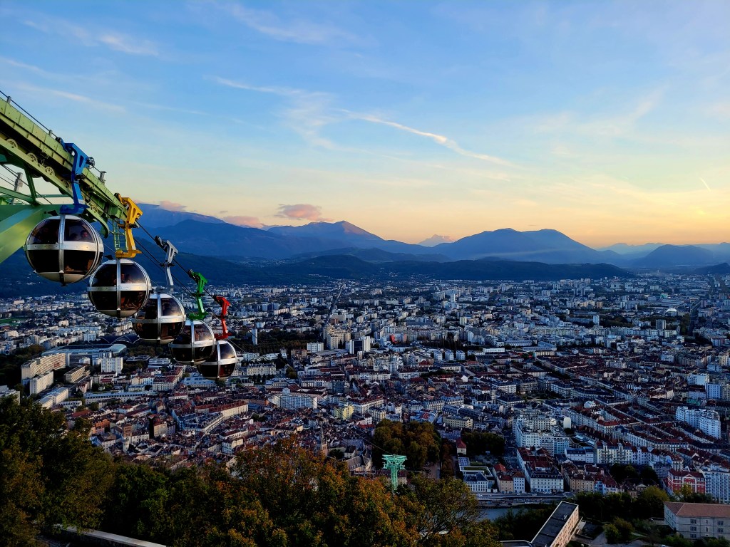 Heureusement, nous arrivons assez vite à l’appartement et nous pouvons y entrer dès 14h30, ce qui nous permet de coucher bébé. Pendant la sieste, Cassandre file courir pendant que Stéphane installe les affaires et s’occupe du linge sale. Nous réveillons Clémence avant 16h30 pour pouvoir assouvir l’une de ses premières passions : les téléphériques. Celui de Grenoble est fabuleux et il offre une vue spectaculaire sur la ville et ses montagnes environnantes.