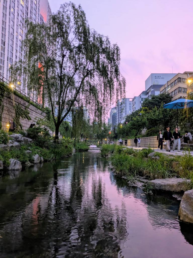Sur son tracé se tenait précédemment une autoroute surélevée qui a été démantelée dans les années 2000. L’opposition a été féroce à l’époque mais les résultats sont édifiants car la pollution dans le centre de Séoul a baissé de 35 % et paradoxalement le trafic routier s’est aussi amélioré. Aucun habitant de Séoul ne voudrait revenir en arrière aujourd’hui tant l’endroit est somptueux. Ce n’est pas juste un canal qui passe mais un véritable ruisseau avec des infrastructures de tous les côtés et même de la faune sauvage puisqu’un héron s’y promenait tranquillement. Nous le remontons au rythme de Clémence, qui s’amuse à passer d’un côté à l’autre par les petits passages aménagés avec des rochers.