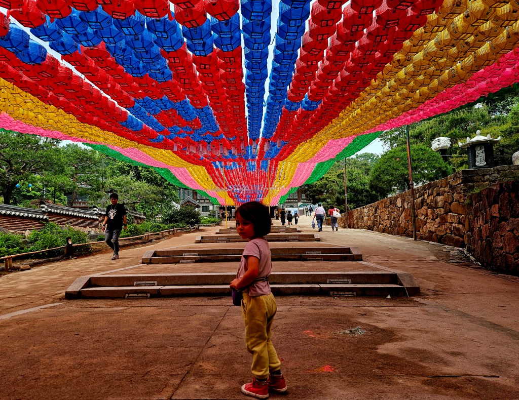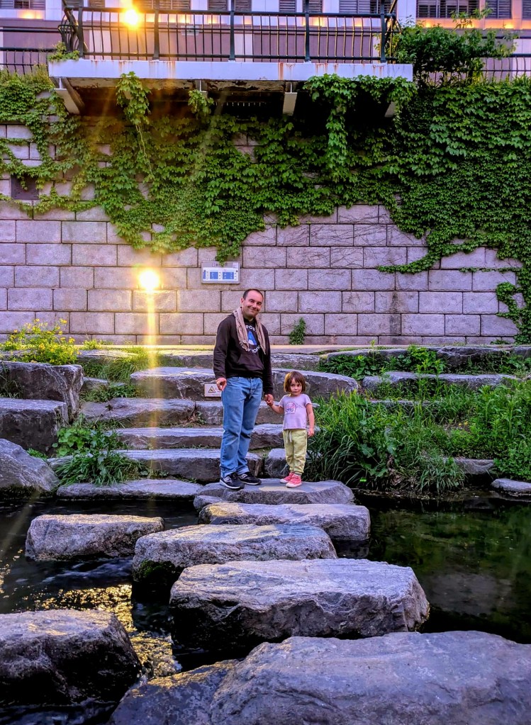 Nous avons beaucoup voyagé avant la parentalité et la présence d’un enfant chamboule évidemment le rythme. Chaque itinéraire prend beaucoup plus de temps car elle s’arrête fréquemment pour observer, ramasser une fleur ou un caillou, s’émerveiller d’une lumière qui clignote. Cela nous pousse à la contemplation aussi, à l’appréciation du temps long. Toutes nos journées sont tournées autour de son bien-être et de ses capacités. Heureusement, elle marche beaucoup pour son âge et se fatigue lentement. Quand elle se sent un peu usée, elle demande à être portée dans les bras ou dans le sac. Elle tombe en admiration totale devant le ruisseau Cheonggyecheon et nous aussi.