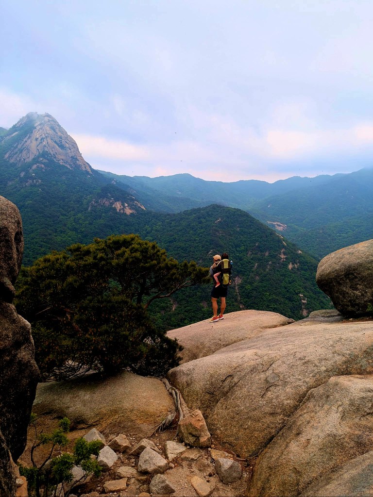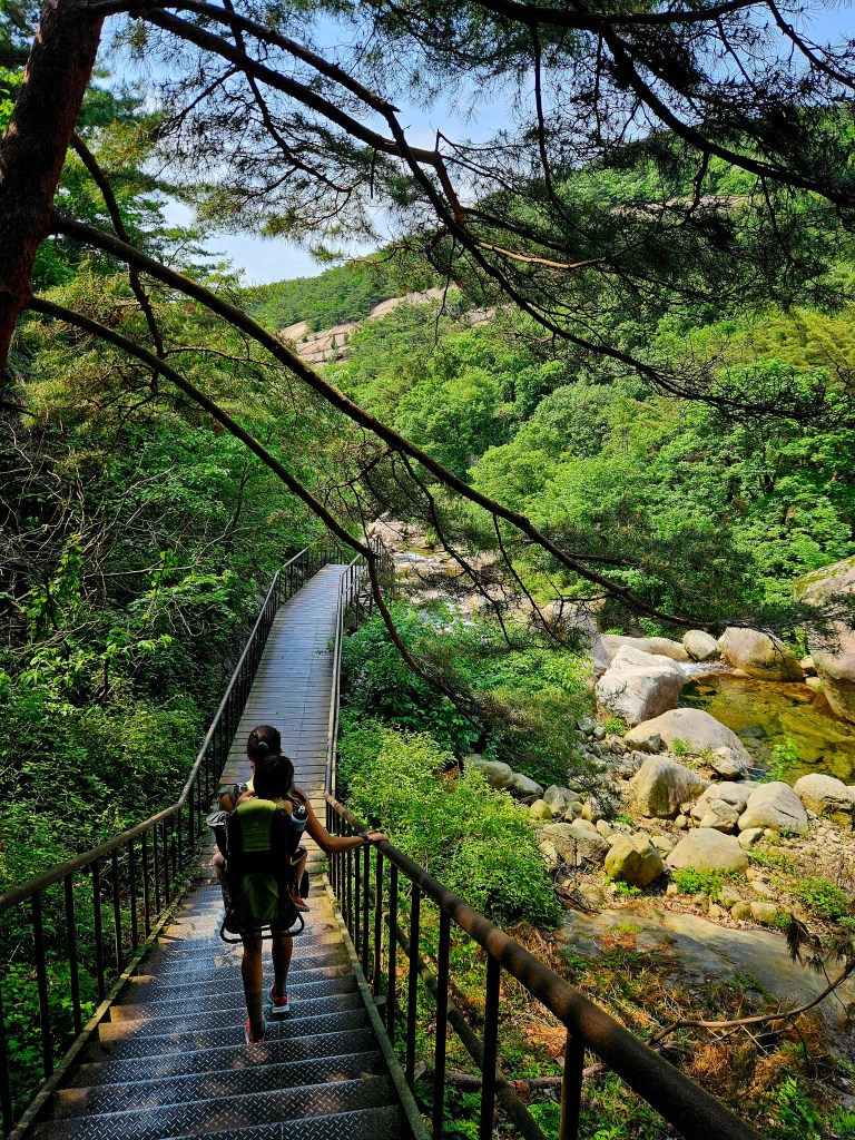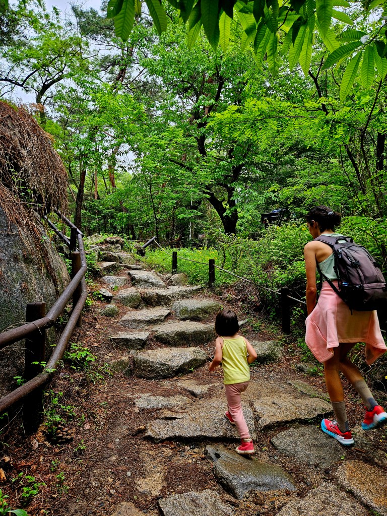 Le premier segment est en pente douce, sur du chemin très roulant. On croise beaucoup de personnes âgées, voire très âgées. La randonnée est un sport national en Corée du Sud et ils prennent cela très au sérieux. Les équipements sont complets et à la pointe. Ils font des têtes surprises quand ils voient Clémence avancer toute seule et lui adressent des saluts amusés. Il faut dire que la petite grimpe sans rechigner, elle monte des marches presque plus grandes qu’elle et le tout à bonne allure !
