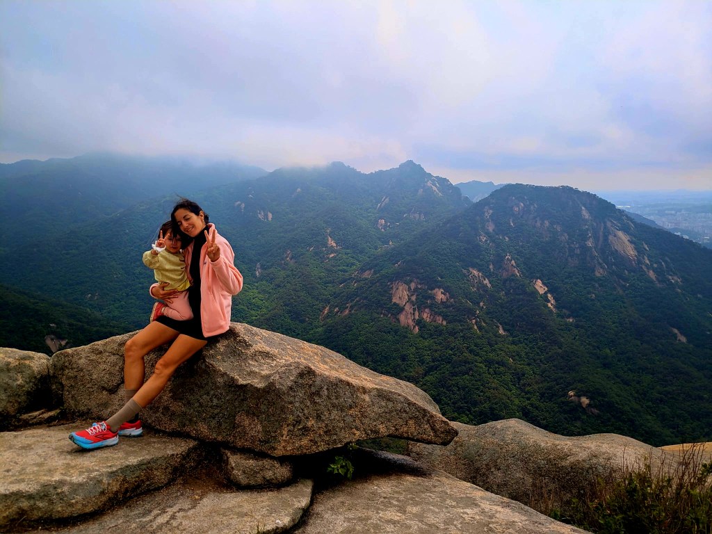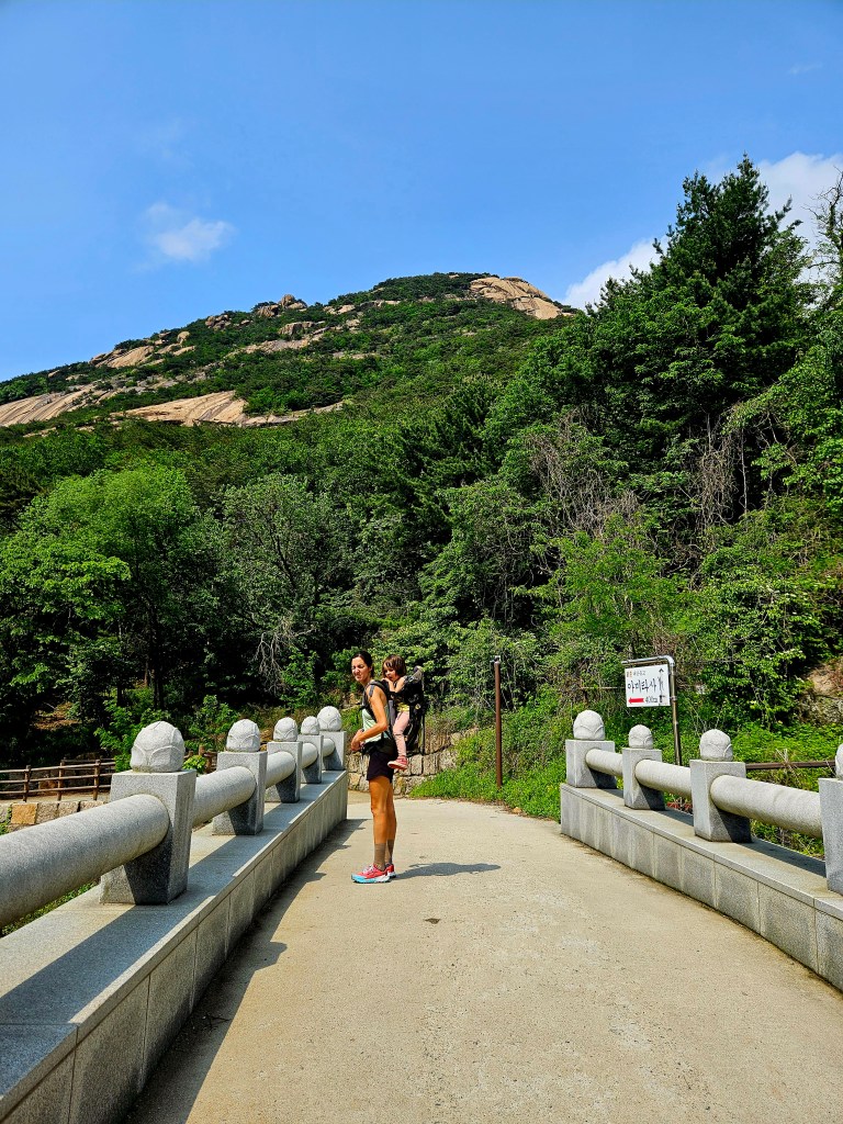 Peut-être que nous ne sommes plus adaptés à la vie des grandes villes ou bien c’est le rythme avec un enfant si petit qui nous déroute un peu. Quoi qu’il en soit, on décide de se mettre au vert et de filer vers le Bukhasan National Park. Après deux métros et un bus où Clémence est toujours la star incontestée, on descend à l’entrée du parc national. On trouve l’entrée facilement et on s’aventure sur une petite ascension de 2.5 kilomètres. De manière étonnante, les abords du parc sont pleins de magasins. On peut acheter tout le nécessaire de randonnée chez des marques réputées ou de quoi se restaurer. On attrape un chocolat chaud, la nouvelle passion de bébé, et un café puis c’est parti.