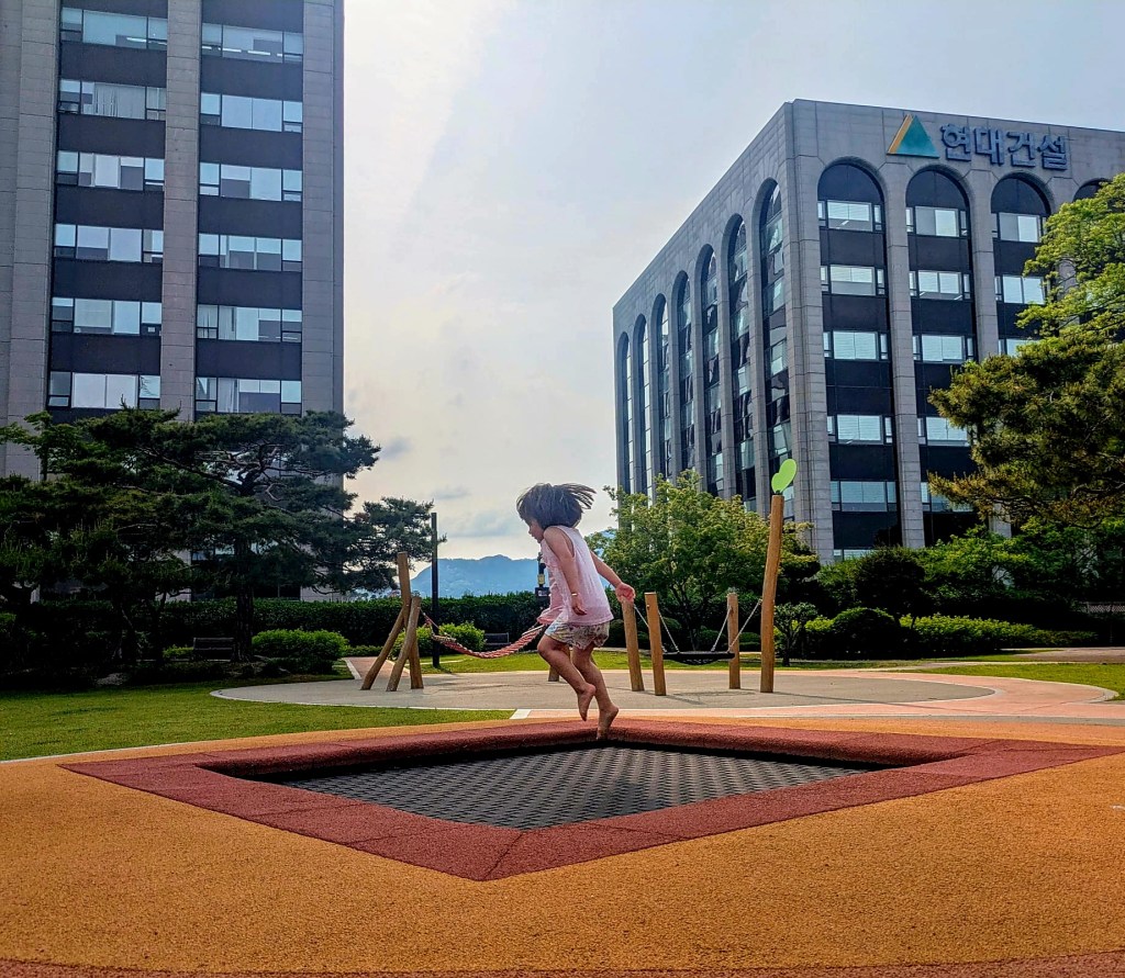 D’ailleurs, on trouve que le tout manque de contexte car il y a peu d’explications sur la nature des bâtiments et quand il y en a, elles ne sont qu’en coréen. Il faudrait peut-être faire les visites guidées mais c’est impossible avec une enfant si petite. D’ailleurs, elle s’ennuie un peu alors nous retournons à l’aire de jeux à côté qu’elle avait bien aimé il y a quelques jours. Ici, on peut faire du trampoline, de la corde, grimper, sauter. Il y a même un coin musculation, encore une fois occupé par des personnes plutôt agées. On y fait les fous pendant un long moment avant de rentrer prendre une douche bien méritée à l’appartement.