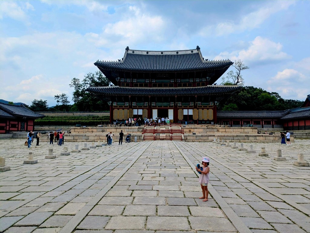 L’alerte de ce matin est définitivement passée et on repart flâner dans deux autres palais royaux de la ville : le Changdeok et le Changgyeonggung. En traînant dans les alcôves, on peut s’imaginer la vie d’autrefois dans ce gigantesque espace de verdure. Les bâtiments sont d’origines, typiques de Corée. Il y a des étangs avec des poissons, ce qui passionne bien plus Clémence que les fragments d’histoire.
