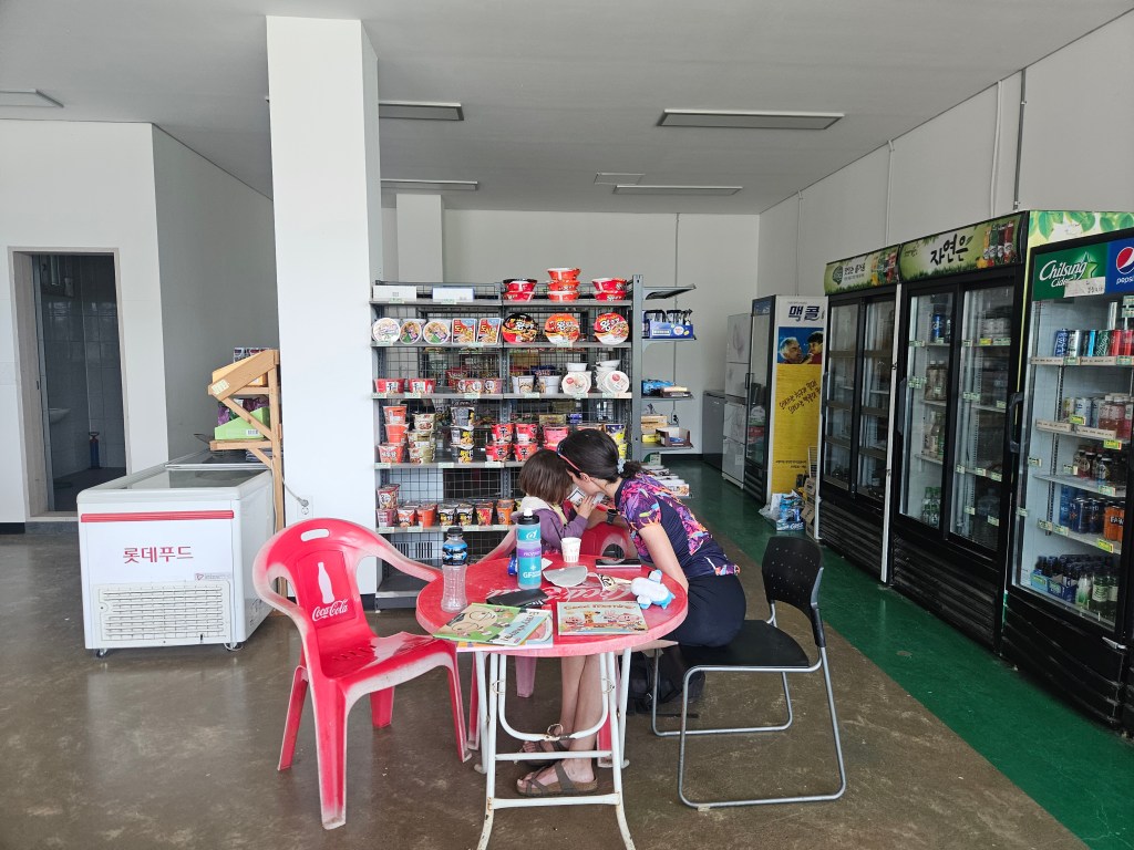 Peu avant midi, nous avons déjà fait la moitié du chemin car nous nous sommes peu arrêtés sur la route. On s’arrête donc manger un brunch dans un café tout mignon et cosy comme on les aime. Le coût de la vie est étonnamment abordable en Corée. On trouve des nuits à l’hôtel entre 30 et 40 euros et on mange facilement à trois pour vingt euros grand maximum par repas. Les supermarchés ou les épiceries de quartier sont aussi très compétitives pour manger sur le pouce. Comme au Japon, il est possible en Corée d’acheter des plats dans les supérettes et de les réchauffer/manger sur place.