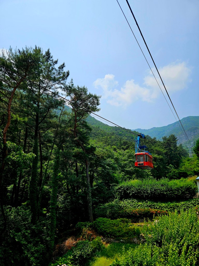 Changement de plan total. Après la déconvenue des deux dernières journées, nous décidons d’annuler toutes les nuits à venir. Il nous faut ralentir le rythme. On décide de traîner dans le petit quartier où nous sommes. Il est très mignon, il y a plein de cafés et de restaurants et les alentours sont très beaux. L’une des difficultés en Corée du Sud est de trouver du contenu touristique en anglais. Par exemple, nous trouvons très peu d’informations sur le Geumosan Provincial Park, parc aux portes duquel nous séjournons et c’est par hasard qu’on découvre qu’un téléphérique y monte à 500 mètres de notre hôtel.
