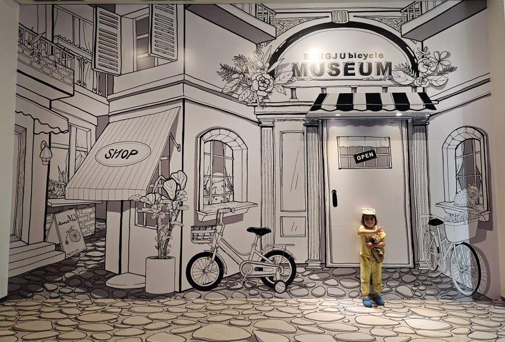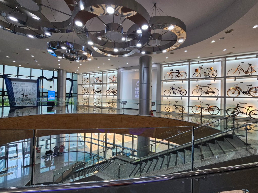 Remis de nos émotions, on s’arrête rapidement en haut d’une côte avec une jolie cascade artificielle qui nous rafraîchit de ses embruns. Nous arrivons peu après au musée du vélo de la ville de Sangju. Bizarrement, au milieu de nulle part, un gigantesque édifice culturel à la gloire de la bicyclette a été construit. Il n’est pas passionnant, c’est une simple exposition de modèle de vélos à travers les âges mais l’un des guides est très marrant. Il tient absolument à nous montrer la collection exceptionnelle de chapeaux et de casques exposés au sous-sol mais il parle si vite avec un anglais très limité et avec tant d’enthousiasme qu’on ne comprend strictement rien.