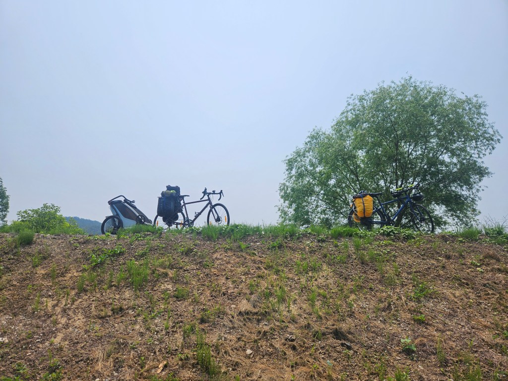 Après la traditionnelle pause aire de jeux, nous profitons de l’air fatigué de Clémence pour repartir et lui faire faire la sieste dans la remorque. Bien que globalement plate, la véloroute nous oppose parfois des murs. Par exemple, au détour d’un virage, une côte à 30 % sur 300-400 mètres (autant dire une éternité) qu’on est obligés de franchir en poussant nos lourdes embarcations tellement l’inclinaison de la pente est infranchissable avec notre cargaison. A certains moments, on est obligés de s’y mettre à deux pour pousser le vélo qui tire la carriole avec Clémence dedans. On est épuisés au sommet et on peine à repartir.