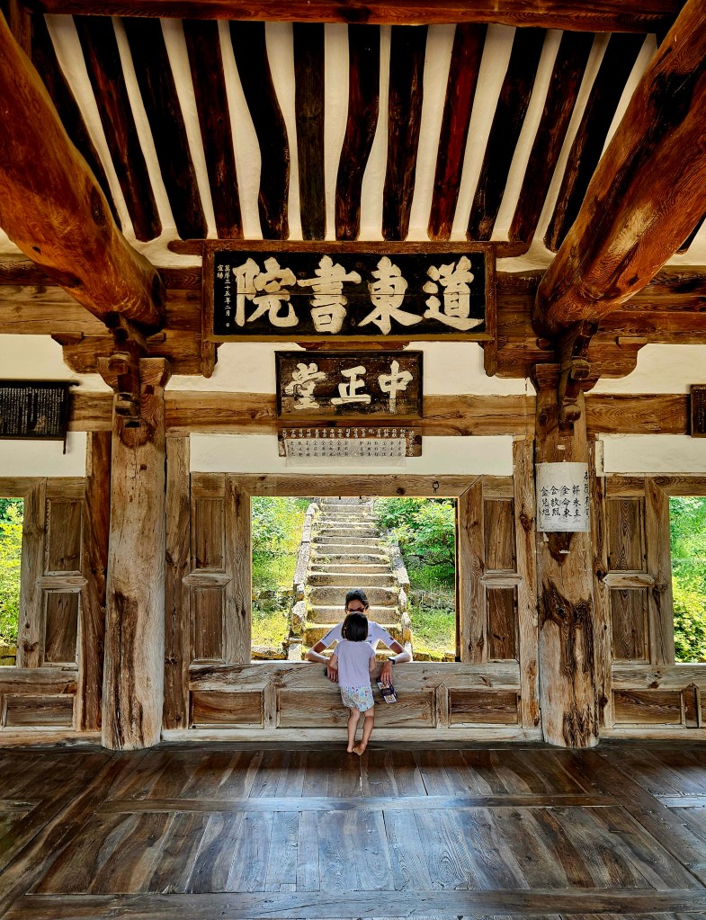 En repartant, la chaleur nous attrape vraiment. Le fond de l’air est désertique et l’arrivée à une ancienne académie du confucianisme signe un véritable répit. Le temple est d’un calme troublant et son ombre est précieuse. On reste à flâner assez longtemps, l’un des gardiens vient donner des gâteaux à Clémence, une scène qui se reproduit finalement plusieurs fois par jour maintenant.