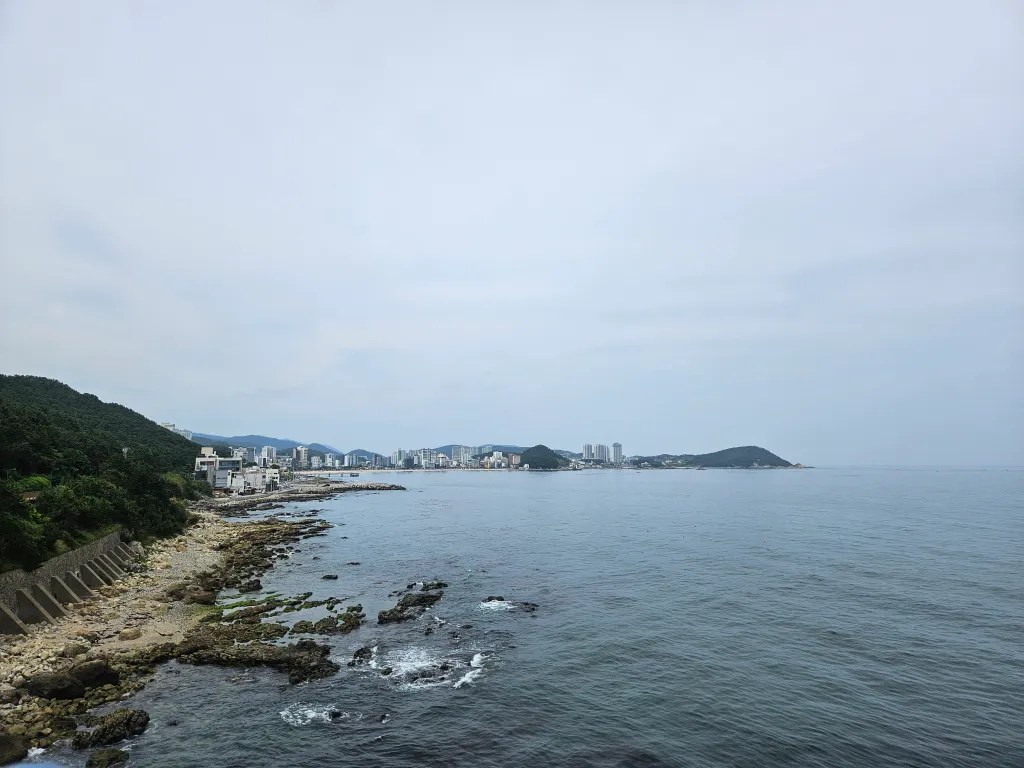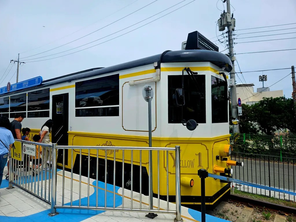 Nous voilà donc dans un petit train qui chemine sur la côte à petite allure. Les sièges sont tous tournés vers la baie vitrée et on peut admirer le relief accidenté de la falaise. La guerre Nord-Sud n’est jamais très loin car une partie de la côte est fermée par des murailles. Au début des années 80, un navire espion nord-coréen a réussi à accoster avant d’être arrêté et le point spécifique est depuis fermé au public. Au terminus du train, on peut descendre pour profiter de la plage qui s’y trouve et on ne perd pas l’occasion d’aller tremper les pieds dans l’eau. Clémence est passée de la peur panique des vagues à vouloir entrer complètement dans l’eau en moins de deux jours. Ce voyage la fait grandir sur plein d’aspects.