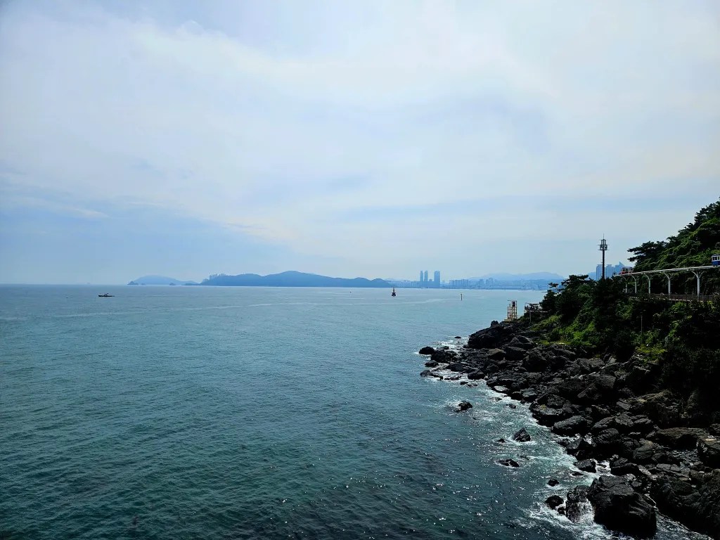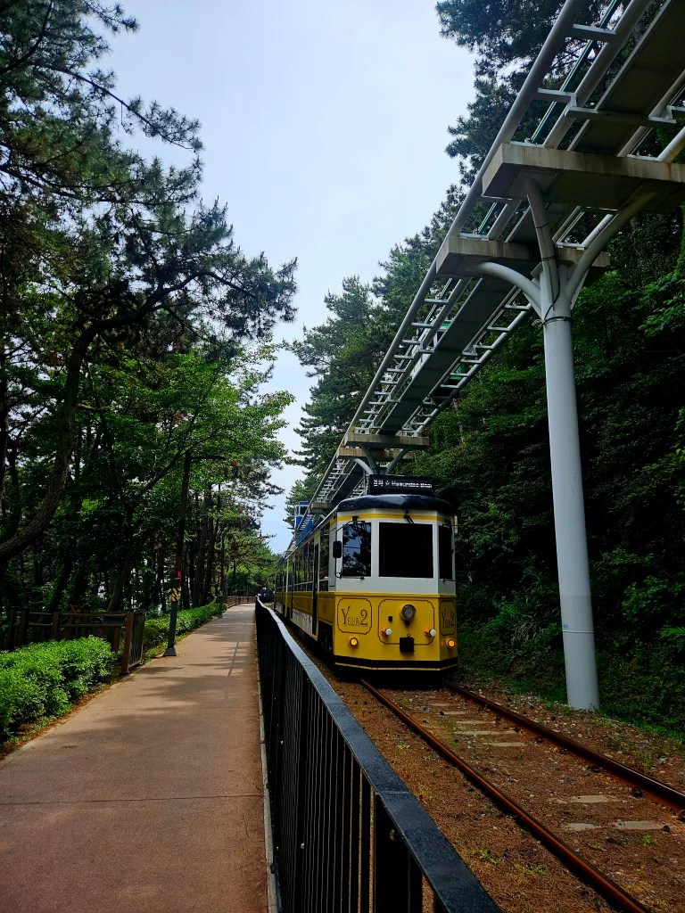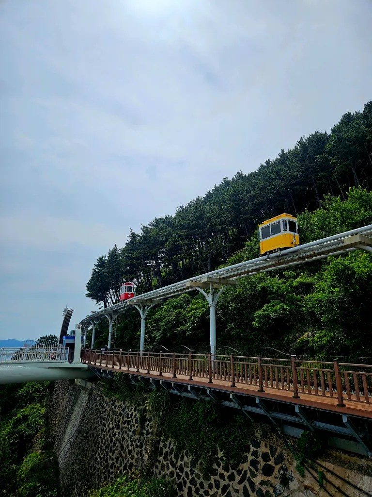 Dans la liste des lieux importants de Busan figure le quartier de Haeundae. Trendy, il est très prisé des étrangers pour sa grande plage bordée de buildings futuristes et pour son atmosphère multiculturelle. C’est aussi un spot de surf, ce qui attire évidemment des gens de toute la planète. Sur la pointe nord de la plage se trouve la Blueline. Au lieu de détruire une voie ferrée en piteux état, l’agglomération a préféré garder les rails et faire une voie touristique sur 4 kilomètres bordé d’un cheminement piéton tout en bois. 20 mètres au-dessus du train, on a aussi la possibilité de « s’isoler » dans des Sky Capsule qui empruntent le même itinéraire que le train mais à bord de petites nacelles colorées de 8 personnes maximum. Le prix prohibitif de 30 euros l’aller simple nous refroidit un peu et on décide de prendre le train.