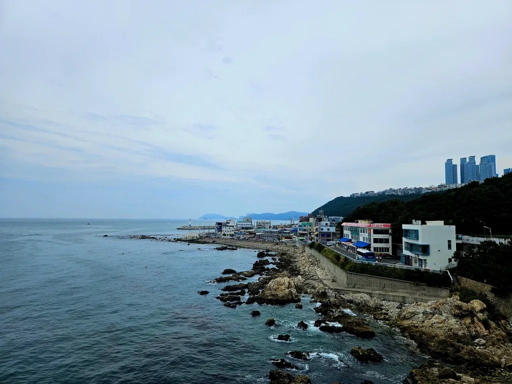 Cette petite fille adore prendre les transports et sa curiosité est toujours très mignonne. Elle essaie tant bien que mal de comprendre pourquoi on ne prend pas le premier bus qui passe et cherche à saisir le sens des couleurs dans le métro (« Maman, on a pris la ligne quelle couleur ? »). Elle n’est donc pas perturbée par les distances parfois longues qu’on doit faire en transports. Ce matin, on se rend dans le petit quartier côtier de Huinnyeoul, autrefois village de réfugiés de la guerre de Corée, transformé aujourd’hui en charmant village culturel et artistique avec une multitude de fresques colorées, de ruelles pittoresques et de cafés relaxants avec vue sur mer. Le village est d’ailleurs souvent comparé à Santorin (en beaucoup moins connu et touristique, heureusement pour nous).