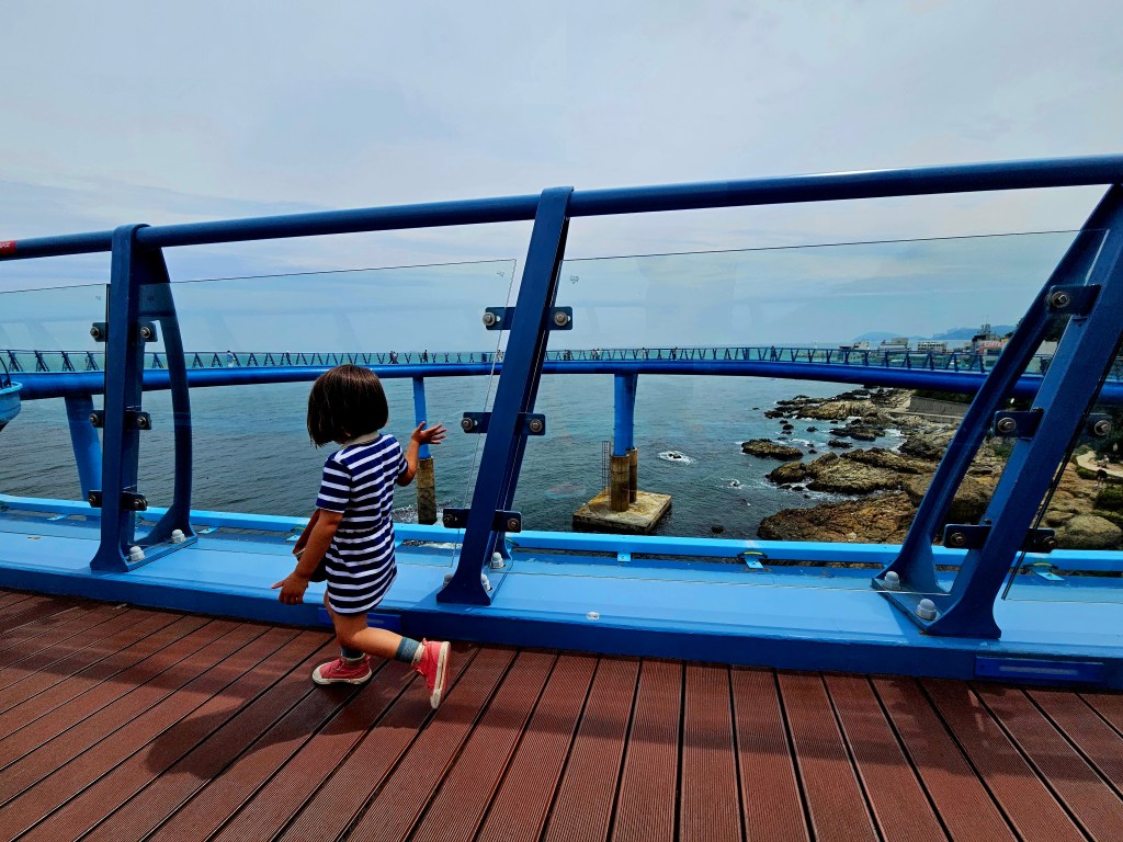 Sur le chemin retour du train que nous décidons de faire à pied, nous faisons une halte sur une passerelle vitrée située 20 mètres au-dessus du sol. La sensation est étrange, on voit l’eau sous nos pieds comme si on allait tomber. Certains touristes sont terrorisés et ils évitent soigneusement les parties où le vide est visible. Clémence n’a pas peur du tout et elle trace son chemin au milieu de la foule. Pour une activité plus ludique, Stéphane l’emmène à l’aquarium de la ville qui se trouve sur la promenade longeant la plage de Haundae pendant que Cassandre va courir. Le lieu n’est pas gigantesque mais assez grand pour satisfaire un enfant. On y voit des tortues géantes, d’immenses poissons. Clémence sort son premier jeu de mot en montrant une raie immense et en disant « regarde, c’est comme un a-raie de bus ». On s’attarde longuement à regarder toutes les espèces marines.