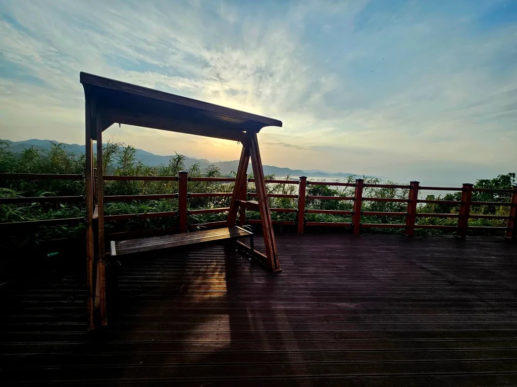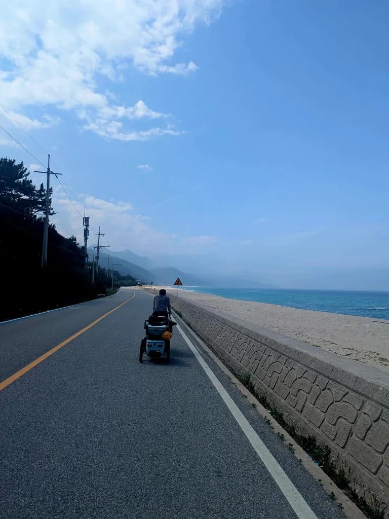 De plus, il lui offre un gâteau et un smoothie. On a bien fait de s’arrêter là ! Il est vraiment sympathique et il parle très bien anglais, une rareté dans ce coin de la Corée. La chambre est plutôt un petit appartement avec une grande terrasse, de quoi profiter un peu d’un repos amplement mérité. Nous ressortons nous balader dans le coin où deux magnifiques plages sont séparées d’une rivière surplombée par une petite montagnette culminant à 60 mètres d’altitude. Une promenade en bois y a été aménagée tout autour et permet de monter au sommet. Une dernière petite suée – mais négligeable comparée à celles du jour sur le vélo – avant d’aller faire quelques emplettes pour le diner que nous prenons tranquillement sur la terrasse de notre chambre avec le coucher de soleil sur les collines en trame de fond.