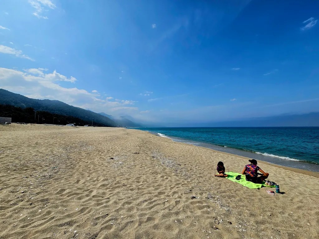 En bas de la descente, une nouvelle plage et le soleil est cette fois accompagné d’un immense ciel bleu, une première pour la journée. On en profite pour s’allonger et expliquer à Clémence le concept des plages sans sable. Ici, il n’y a que de tous petits cailloux et des bouts de coquillages, ce qui l’intrigue un peu. Elle s’en accommode vite et ce n’est que le retour de la brume maritime (la même que ce matin) qui nous déloge. On finit notre étape dans la ville de Uljin accompagnés d’un brouillard crémeux étrange qui n’annonce rien de bon pour le lendemain.