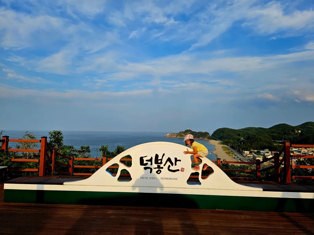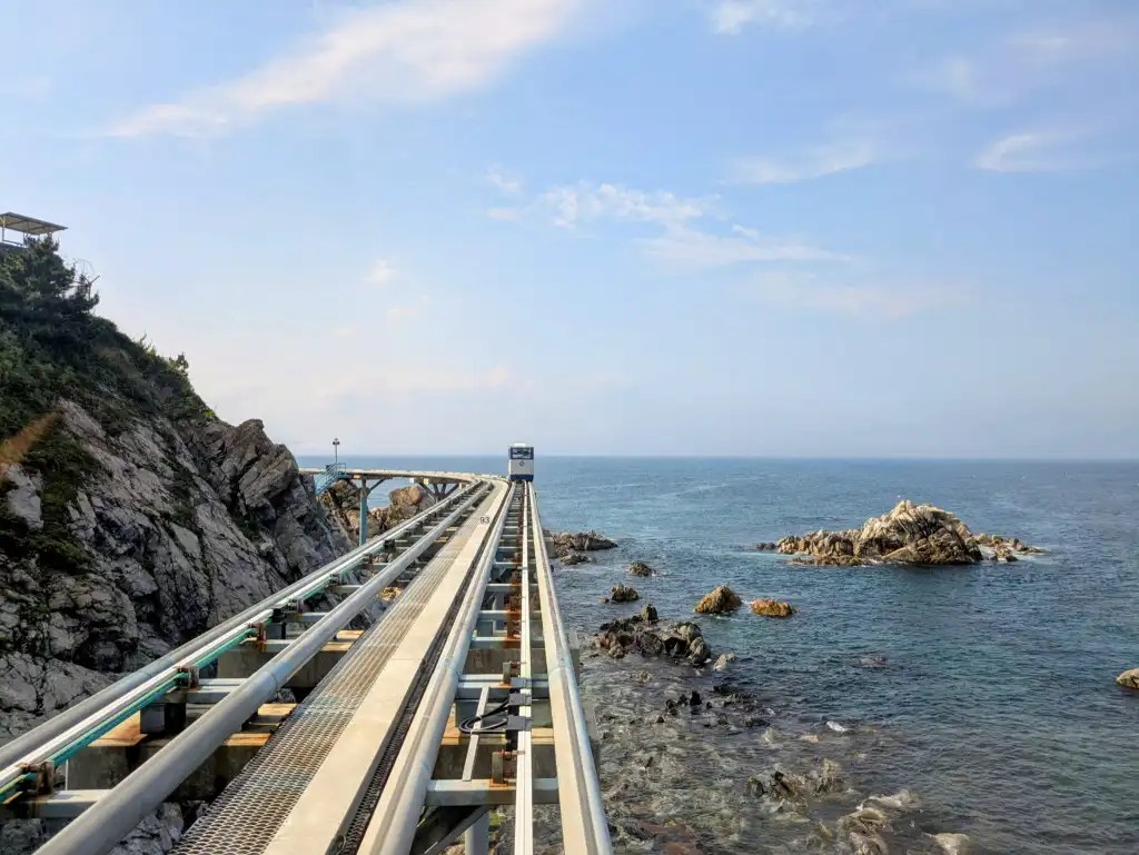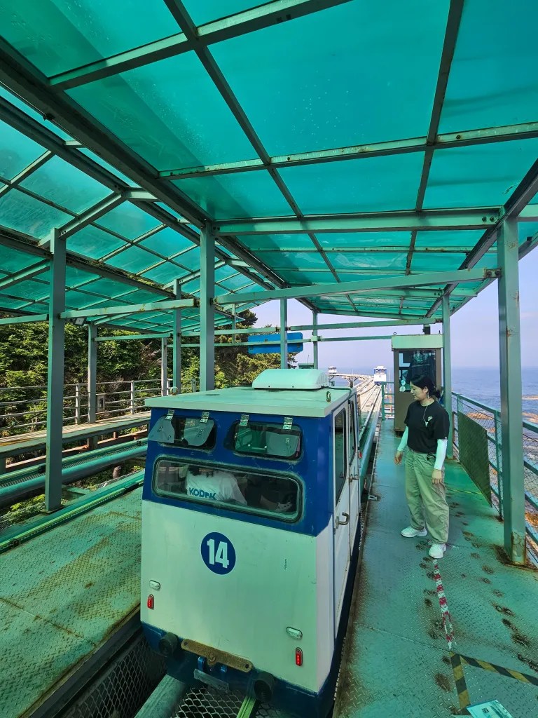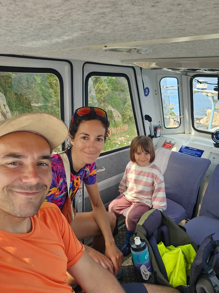 Quand on en ressort, c’est un crachin tout fin qui tombe du ciel, la dernière traînée de ce gros orage car on aperçoit enfin le ciel bleu. On essaie tant bien que mal de nettoyer une aire de jeu pour que Clémence profite un peu puis nous prenons enfin la route. Le temps se dégage enfin mais le long de la côte la brume colle aux collines. Elle fait l’effet d’un coton qui s’accrocherait mais elle disparait aussitôt qu’on la traverse. On atteint le port de Jukbyeon où une installation vétuste propose aux touristes de grimper dans des petites capsules le long d’un monorail à flanc de falaise. La structure est dévorée par l’humidité et la rouille, les wagons grincent de tous les côtés mais la vue est fantastique. Clémence est aux anges, elle nous montre tout du doigt.