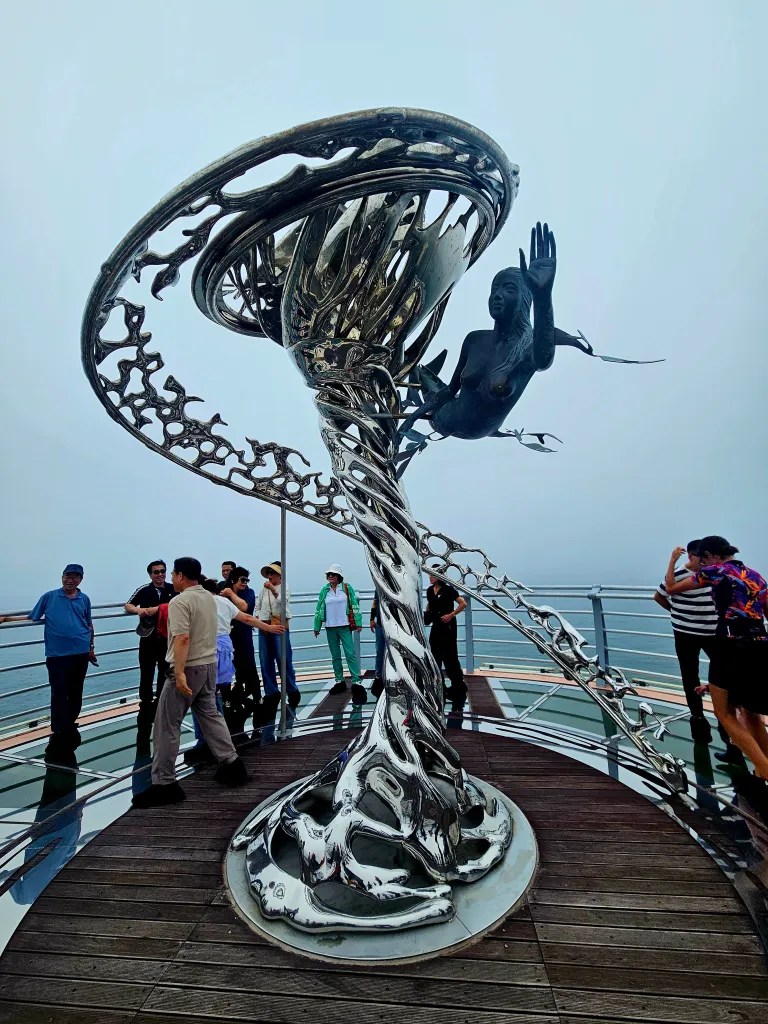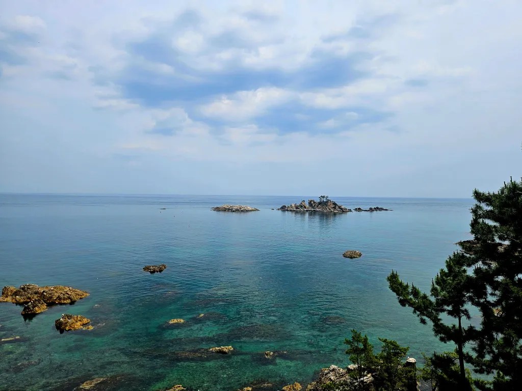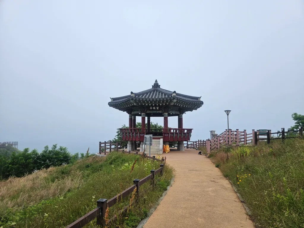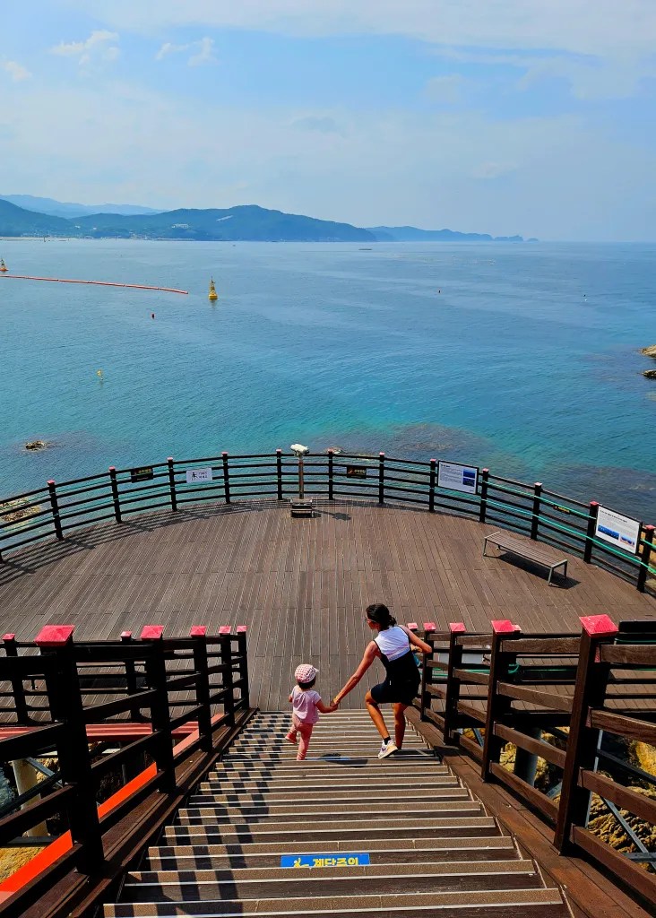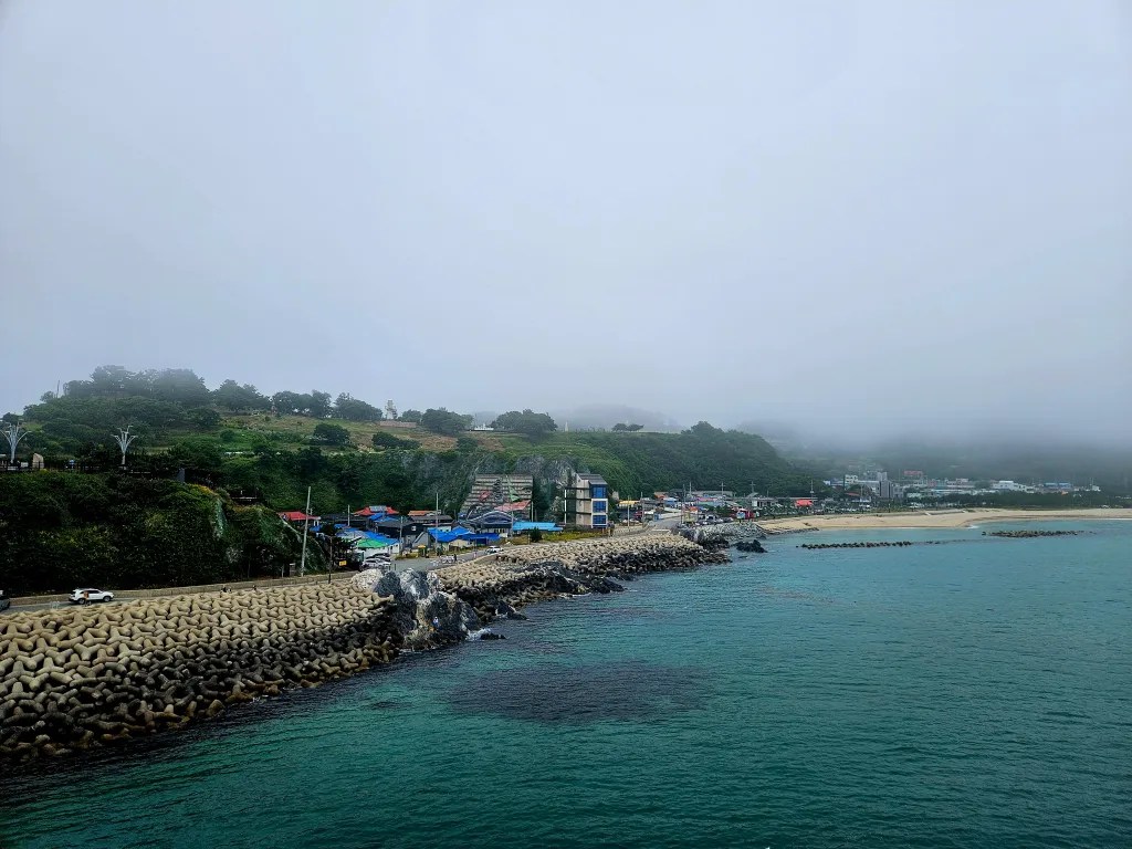 En ouvrant les rideaux de notre pension délabrée, nous avons une vue imprenable sur l’horizon. Enfin il était là quand on s’est couchés, il doit donc toujours y être derrière l’épaisse couche de brouillard. Clémence s’est réveillée pile à l’heure du réveil vibreur de la montre de Cassandre et elle est d’excellente humeur. Il est assez tôt, ce qui nous permet d’atteindre le port d’Hupo 10 kilomètres au nord avant 10 heures pour prendre le petit-déjeuner dans un café quelconque. Après quelques courses au supermarché pour le repas du midi, on grimpe quelques escaliers pour rejoindre une passerelle vitrée avec vue plongeante sur la mer. Les coréens adorent ce concept, il y en a à foison sur tout le territoire.