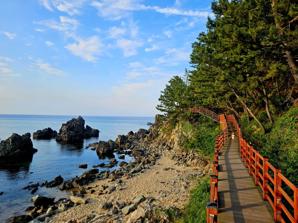 Nous sommes dimanche et l’endroit est bien plein. Il est difficile de circuler non pas à cause de la densité mais parce que les gens bloquent tout l’espace pour se prendre en photo. On peut vous faire patienter trente secondes sans aucune gêne, c’est la dérive du tout à l’égo de notre époque. On ne s’attarde pas et on roule jusqu’au pavillon de Wolsongjeong, qui est un peu quelconque. Heureusement, une grande plage se trouve derrière avec une petite supérette.