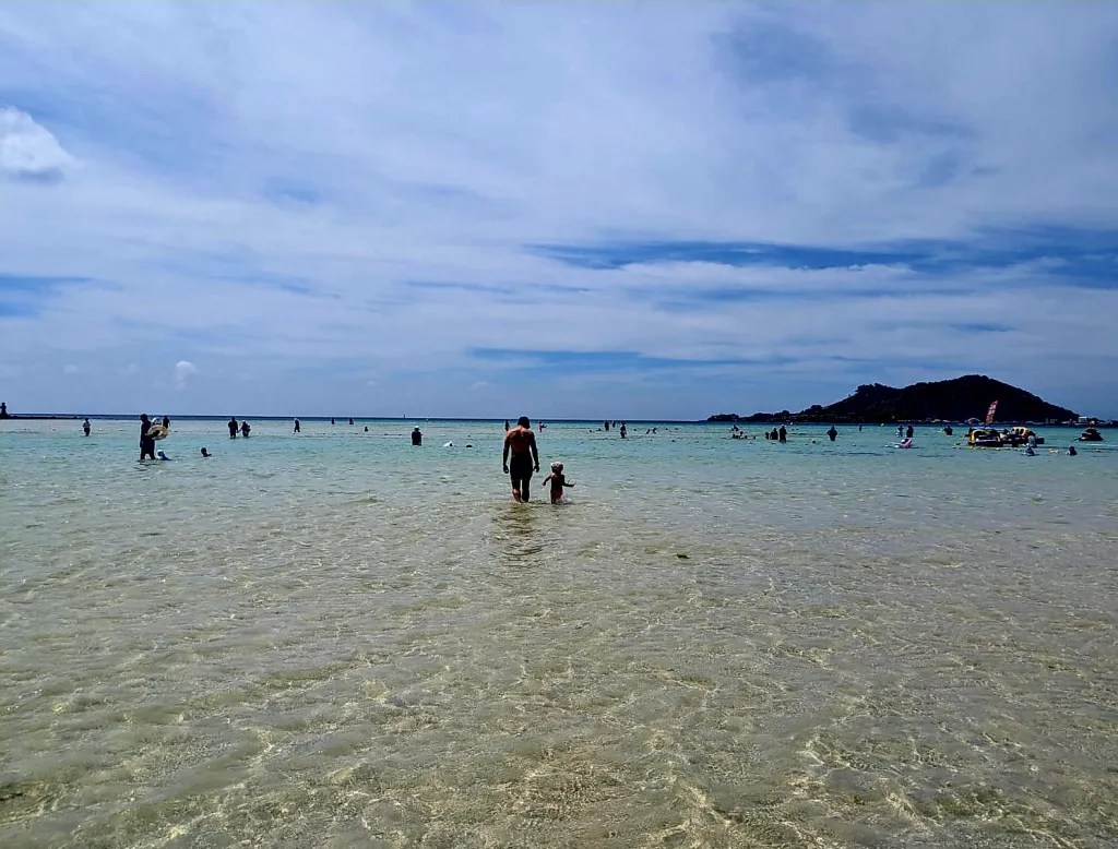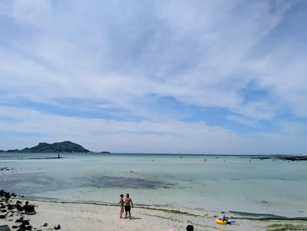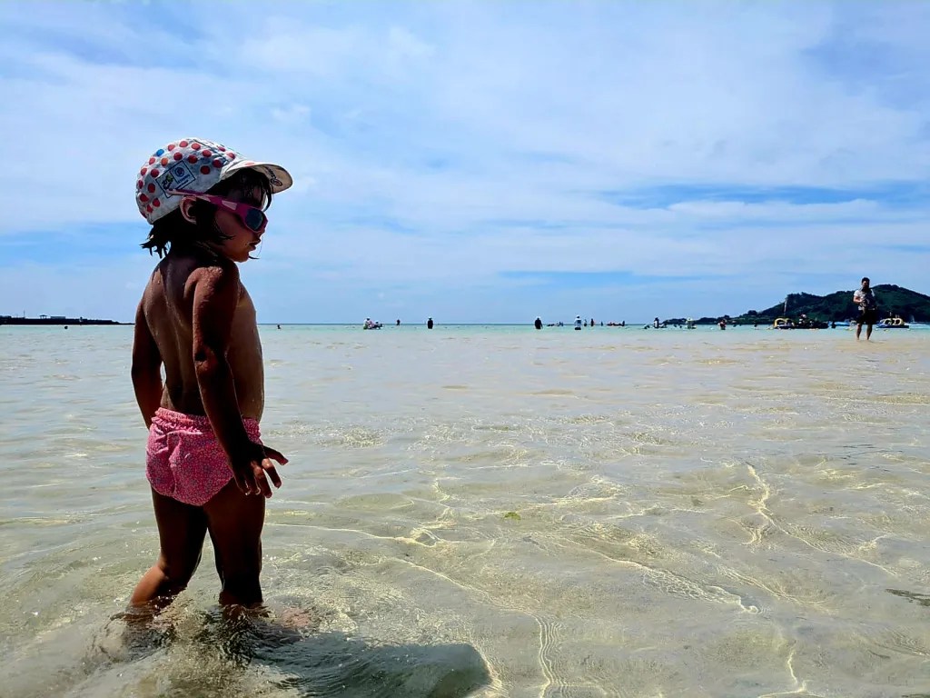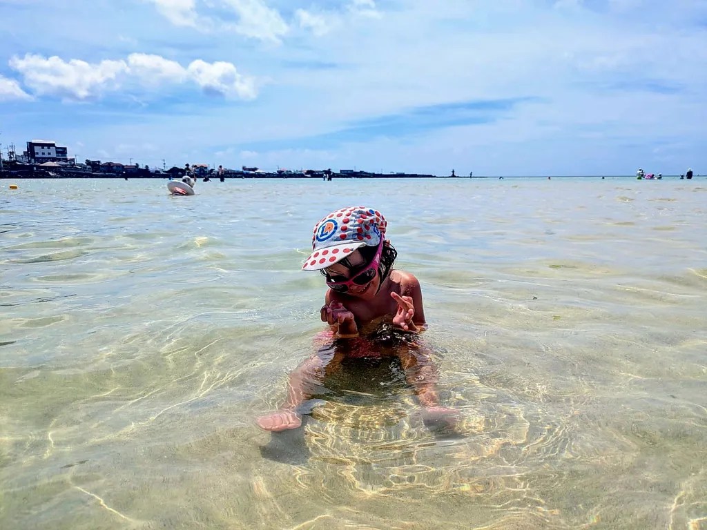 Nous roulons à un pénible 15 km/h en appuyant avec ardeur sur nos pédales, bien loin de notre rythme de croisière habituel. Nous sommes déjà épuisés en arrivant à notre premier arrêt du jour, la plage de Geumneung. Notre fatigue est vite oubliée car elle est splendide. On dirait un lagon grec, la baie est remplie de petites piscines d’eau turquoise idéales pour les enfants et l’eau avoisine les 30 degrés. Nous avons encore pied à plus de cent mètres du rivage et c’est un régal de s’y amuser avec Clémence.