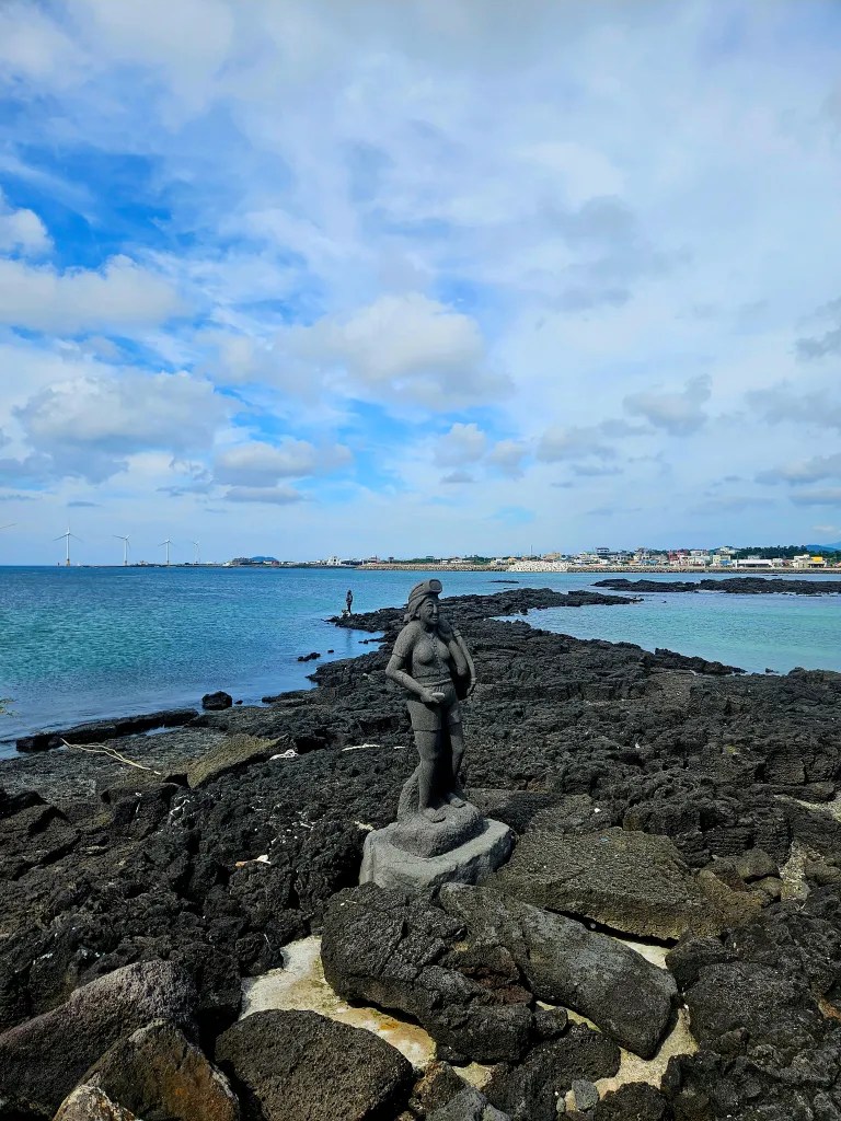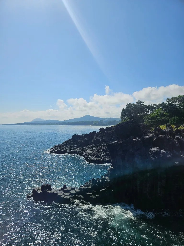 On se maudit d’avoir prévu une étape si longue mais on ne pouvait pas savoir qu’il ferait si chaud. Pour couper l’effort, on s’arrête pour voir la falaise de Jusangjeollidae connue pour ses formations rocheuses noires assez étonnantes qui forment un escalier polygonal composé de plusieurs piliers créés par la condensation subite de la lave en fusion s’écoulant dans la mer. Mais c’est là aussi en plein soleil alors on choisit la fuite en avant. On tente de faire une pause à l’abri d’un parc arboré mais rien n’y fait, il fait trop lourd et on transpire sans bouger. On part pour avaler les 15 derniers kilomètres d’un coup mais en passant sur un pont, on entend des bruits d’enfants qui jouent dans l’eau.
