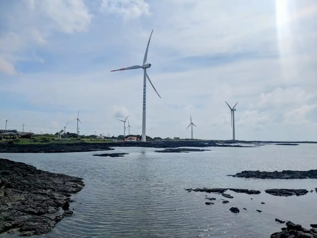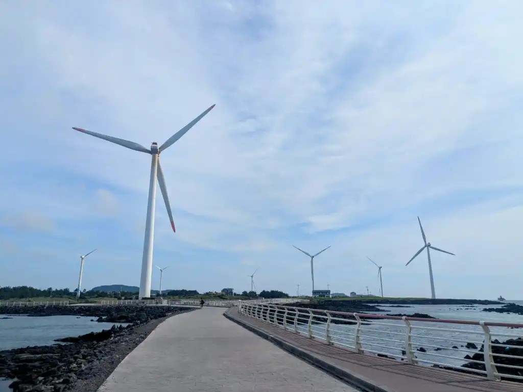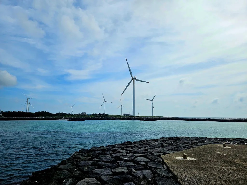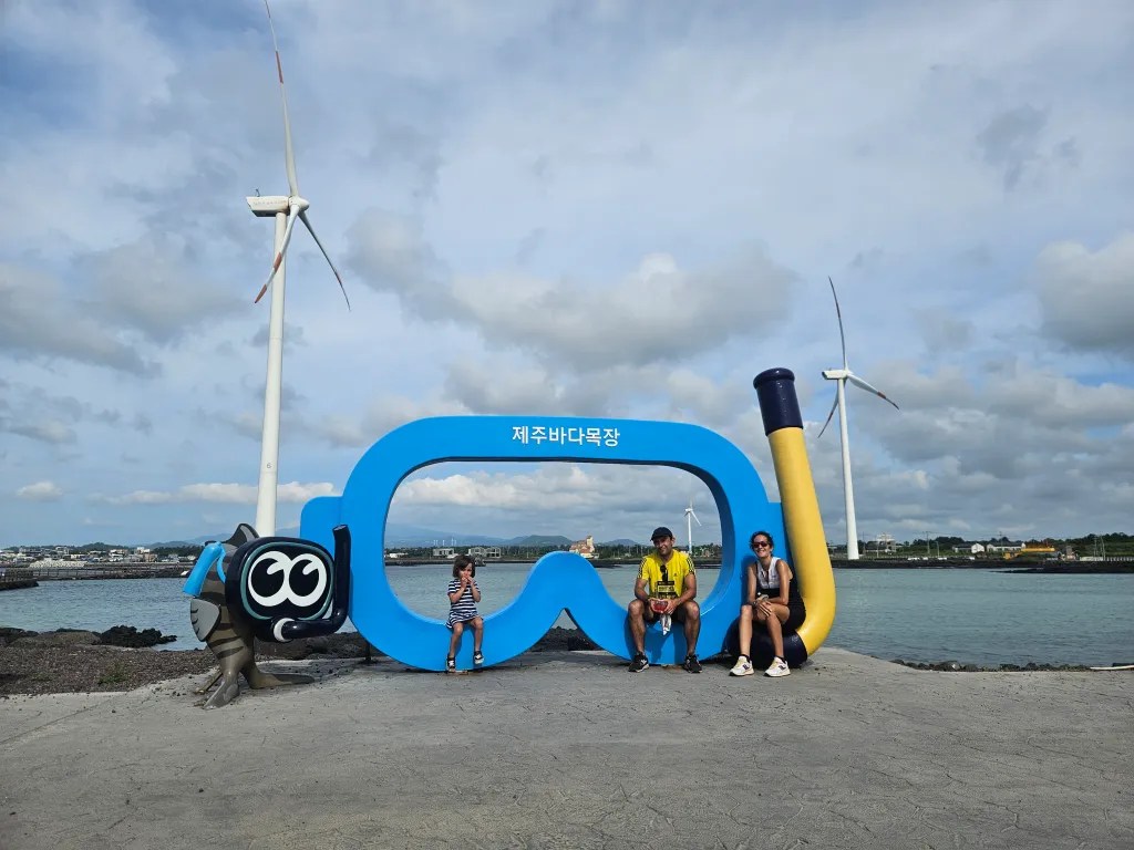 Nous réveillons Clémence pour qu’elle admire avec nous un sentier piéton qui a été aménagé sur l’eau et qui relie plusieurs éoliennes. Depuis que nous roulons sur Jeju, on constate qu’il y a beaucoup de parcs éoliens offshore (= en mer) à quelques encablures de la côte. On voyait très peu d’éoliennes en Corée jusqu’ici, il faut croire qu’elles sont toutes implantées ici. En même temps, avec un vent puissant et constant comme ici, ce serait dommage de s’en priver. Quoiqu’il en soit, c’est très impressionnant de voir ces monstres d’acier de si près, on passe vraiment au pied de celles-ci. On se promène tranquillement quand on aperçoit un drone qui nous filme, qui se rapproche et qui manque de frapper Stéphane à la tête. Il a juste le temps de se baisser pour l’éviter. On a beau chercher autour de nous, on ne voit pas le pilote. Il vient à nous quelques minutes plus tard. C’est un jeune coréen avec un ami, ils s’excusent platement et ils expliquent avoir perdu le contrôle à cause du vent. En contrepartie, il propose de nous prendre en photo avec son appareil de professionnel et nous acceptons bien volontiers.