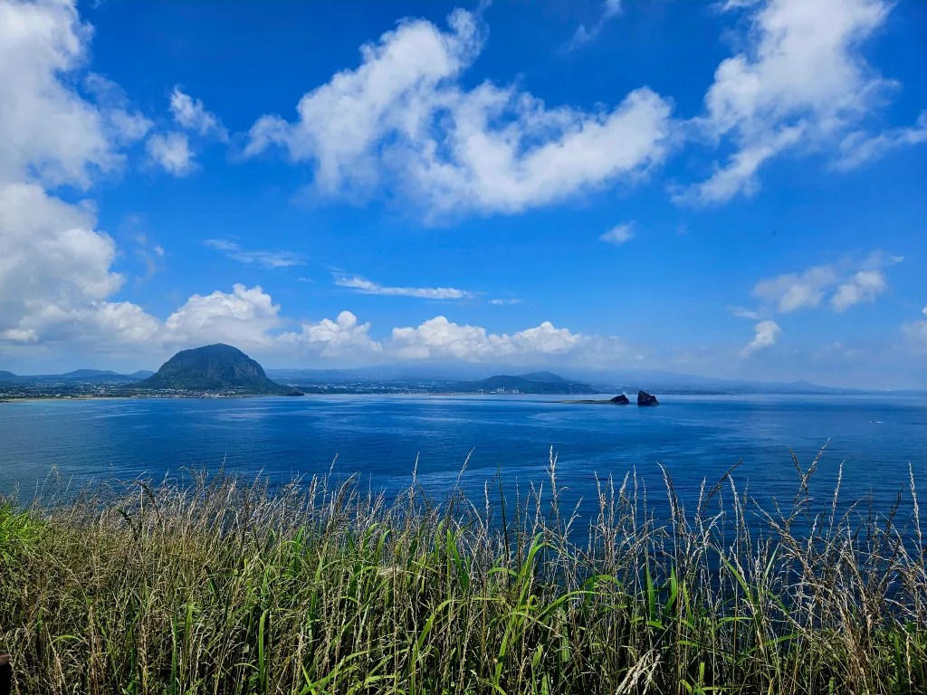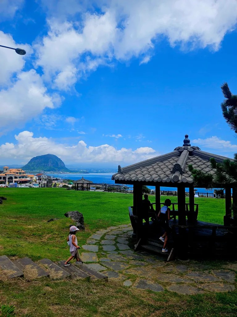 Comme nous sommes partis tard, on enquille 14 kilomètres d’un coup pour arriver au Songaksan Trail. C’est une promenade côtière qui fait le tour du volcan éteint éponyme en offrant des vues à couper le souffle sur la mer et les falaises environnantes. Nous n’en faisons qu’une partie car la chaleur est encore suffocante malgré la brise (qui souffle peu aujourd’hui) et ce n’est pas très prudent avec Clémence. La côte est incroyablement belle notamment grâce au sommet montagneux nommé Sanbangsan qui se dresse droit devant nous de l’autre côté de la baie. Haut de 400 mètres, il semble être posé sur la plaine. Les paysages rappellent la Nouvelle-Zélande ou l’Ecosse, il est difficile de croire qu’on est en Corée du Sud.