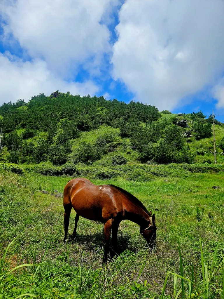 La dernière partie du trajet est moins dense et plus agréable en terme d’aménagement car elle longe la côte presque tout le long. Par contre, le vent ne se lasse jamais de nous souffler dans les visages et nous n’en pouvons plus en arrivant à l’hôtel du jour. Pour 25€, nous avons une chambre très spacieuse avec une immense baie vitrée et une terrasse en bord de mer. La côte ouest de Jeju est très sauvage et très peu peuplée. Il y a juste quelques hôtels, fermes et habitations qui s’égrènent le long de la route. Le paysage change aussi. Alors que jusqu’ici le littoral était principalement constitué de roches volcaniques noires et ponctué de plages de sable fin, on serpente désormais à travers de grande collines herbeuses balayées par le vent qui font plus penser à l’Ecosse qu’à une ile tropicale.