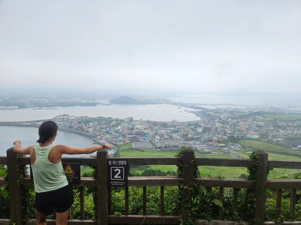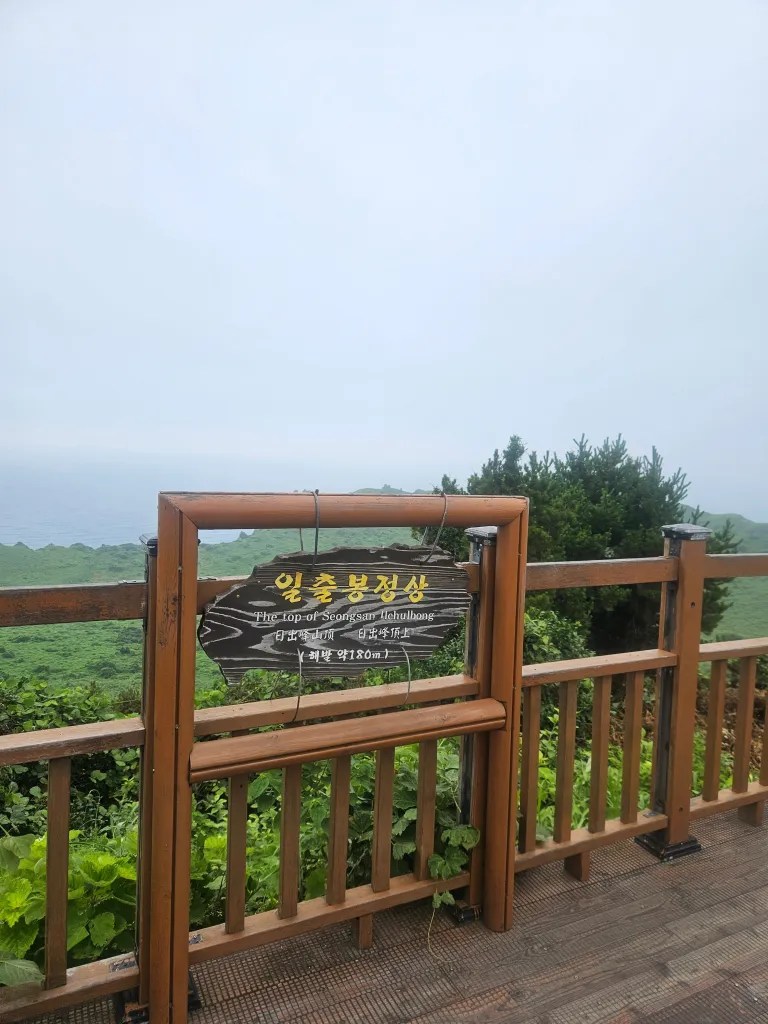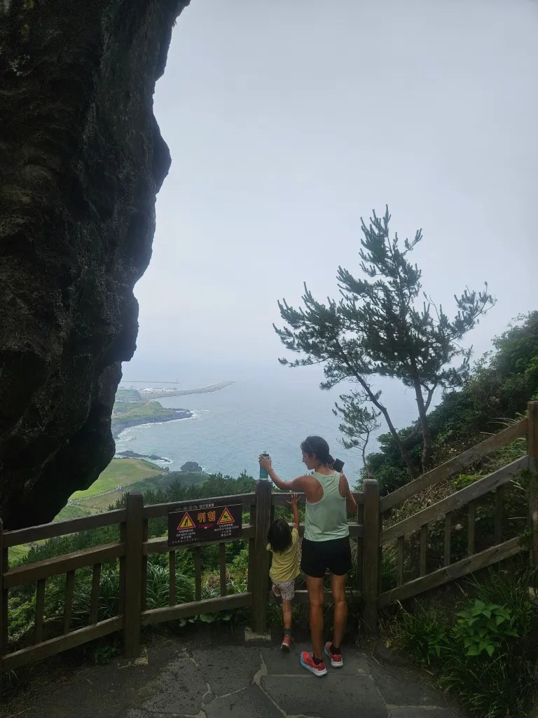 Après une douche rapide dans notre chambre, on prend directement la direction de Seongsan Ilchulbong. C’est un immense cratère, stigmate d’une éruption hydro-volcanique. Il faut grimper 250 mètres de marches pour y arriver et Clémence monte tout sans aide, ce qui impressionne beaucoup les autres marcheurs. Le cratère est vraiment impressionnant, complètement recouvert d’herbe, il forme une immense cuvette qui semble forgée par la main de l’homme. Il paraît que le lever de soleil est spectaculaire mais nous n’avons pas la foi de nous réveiller à 5 heures du matin pour y assister. On préfère croire les gens sur parole.