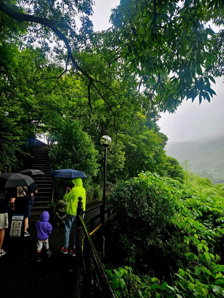Le lieu de culte est très joli et les fins rideaux de pluie lui donnent un charme presque mystique et font ressortir le côté luxuriant de la jungle qui l’entoure. A son sommet se trouve donc l’immense Bouddha allongé. La statue est si grande que les pieds de Buddha sont plus hauts que nous. On en profite tant bien que mal car la pluie a redoublé d’intensité. Nous flânons entre les petites volées de marche à admirer les cascades et l’architecture nippone.