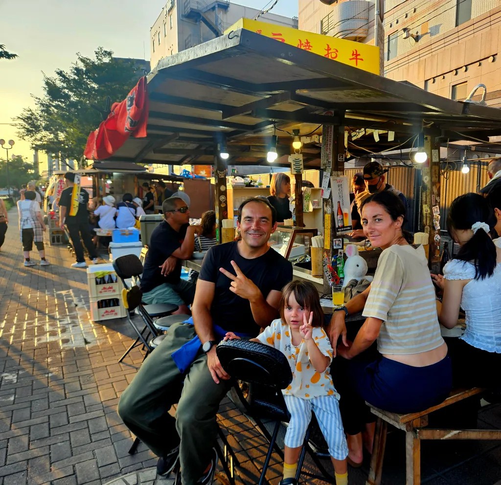 Après le goûter, nous rentrons faire un brin de toilette à l’appartement puis nous ressortons manger. Fukuoka est la ville de la streetfood au Japon et les petits étals, appelés ici « Yatai », poussent comme des champignons dès que le soleil commence à décliner. On en trouve dans plusieurs coins de Fukuoka et l’un des principaux se trouve à quelques encablures de notre logement, en bordure du fleuve Mikasa qui traverse la ville. On s’installe sur des tabourets précaires d’une petite échoppe et on commande un bol de ramen et des yakitoris. Clémence se régale mais nous restons sur notre faim. On ne peut pas non plus prendre tout ce qu’on veut car le budget est plus serré pour le Japon.