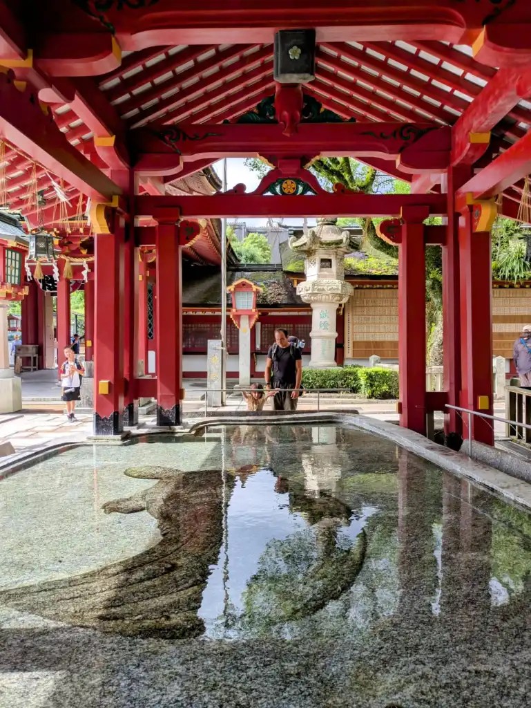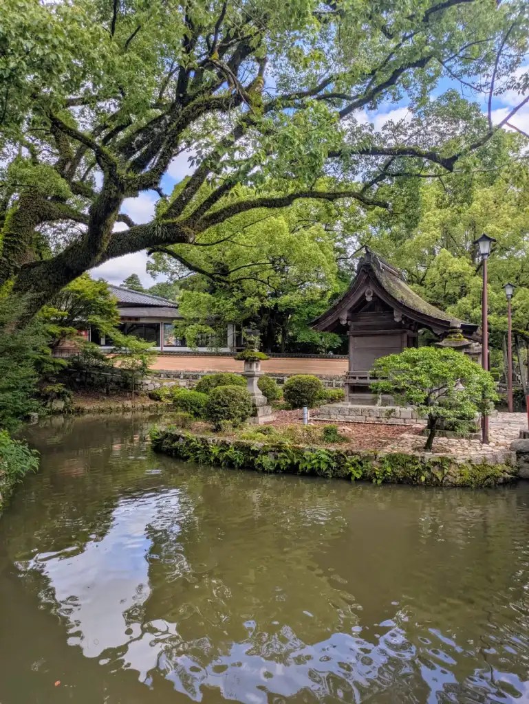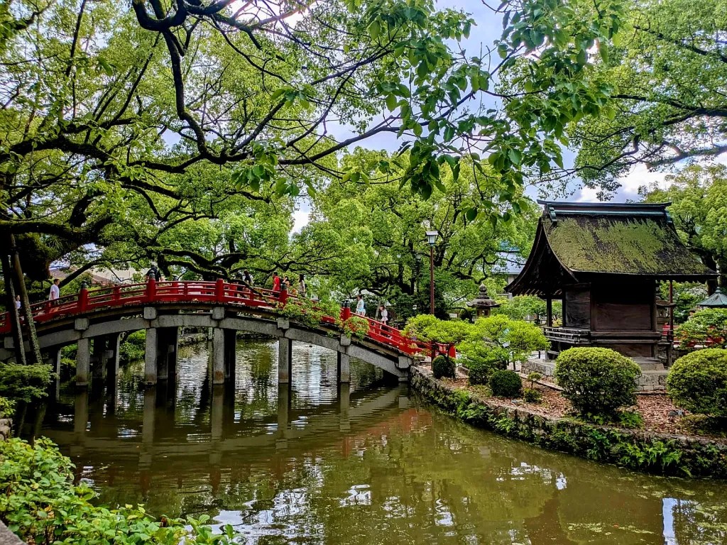 Nous devons prendre le train à une autre gare de la ville pour nous rendre au joli village de Dazaifu et puisque nous passons devant l’appartement, on s’y arrête pour manger les restes de la veille. On ne lambine pas et nous sommes vite ressortis. A cette gare aussi, direction le parking à vélos. Les japonais souhaitent garder l’espace public libre. Cette gare est plus petite et on s’y repère plus vite. Nous sommes vite à Dazaifu et on s’y promène sans réel but, si ce n’est d’apprécier les façades des maisons, visiter son temple, traverser les petits ponts typiques et admirer les jardins joliment entretenus.