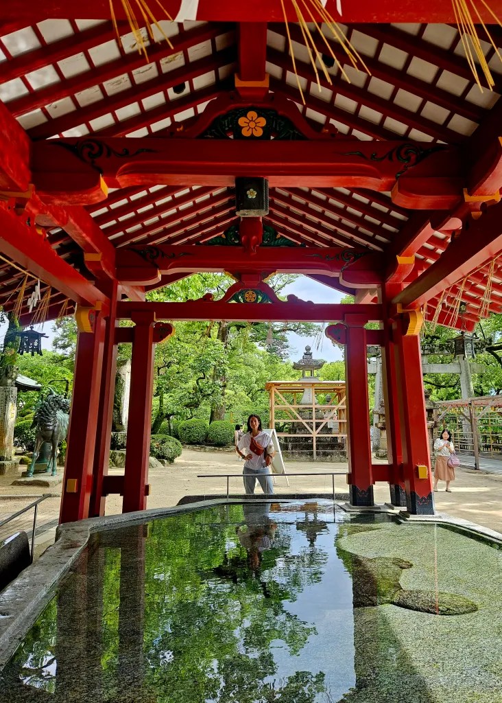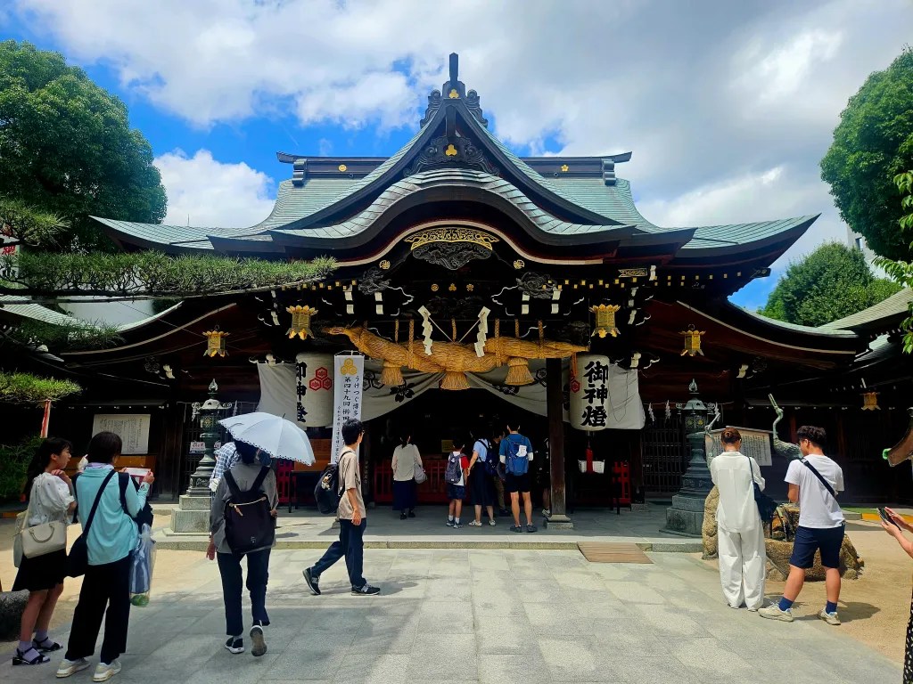 A l’heure pile, nous sommes sur nos vélos, prêts à affronter le trafic de Fukuoka. Nous visitons d’abord le temple Tochoji puis celui de Koshida, le plus important de la ville et point névralgique du très célèbre festival Hakata Gion Yamakasa qui se tient la première quinzaine de juillet à Fukuoka et qui attire chaque année près de deux millions de visiteurs. Des équipes formées par des hommes en tenue traditionnelle font la course en yamakasa, des chars d’une tonne décorés de toutes les couleurs, sur 5 km dans les rues de Fukuoka et plus particulièrement dans les quartiers de Hakata et de Gion.