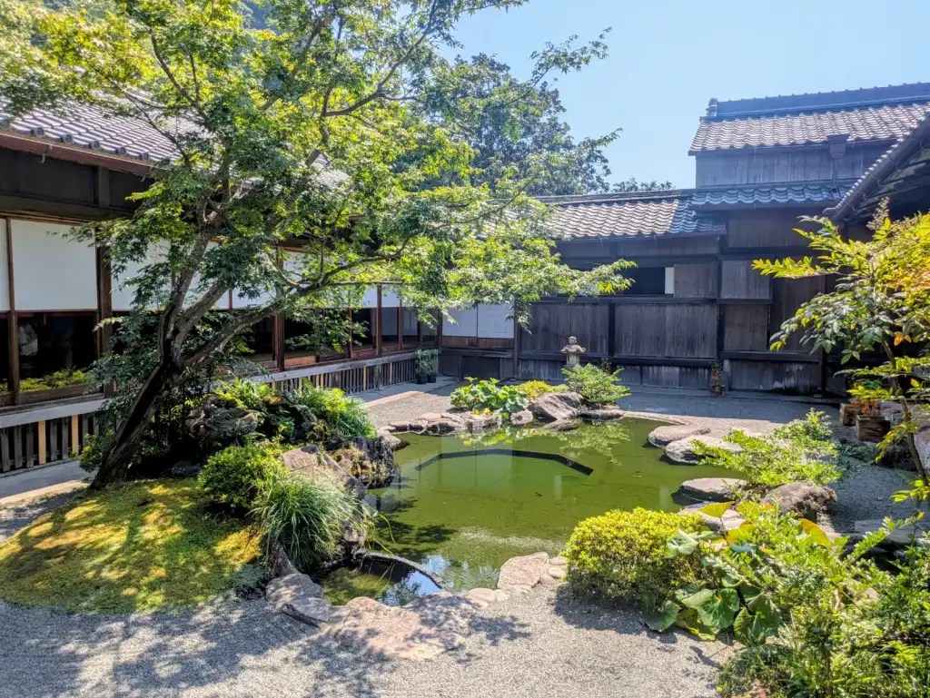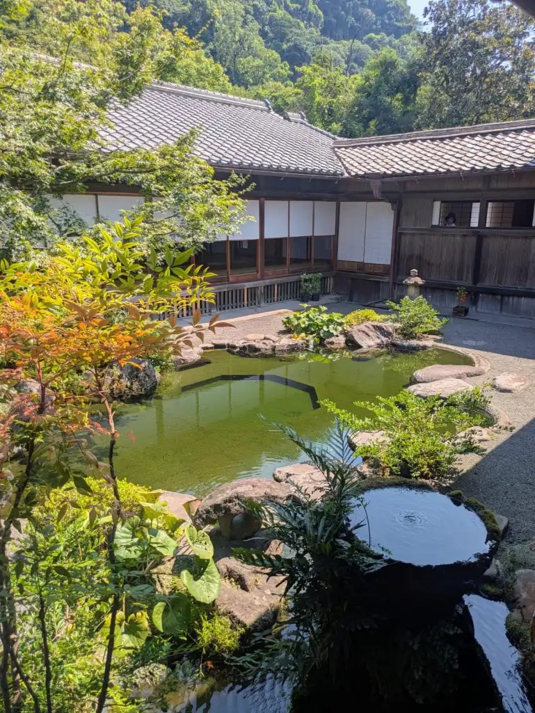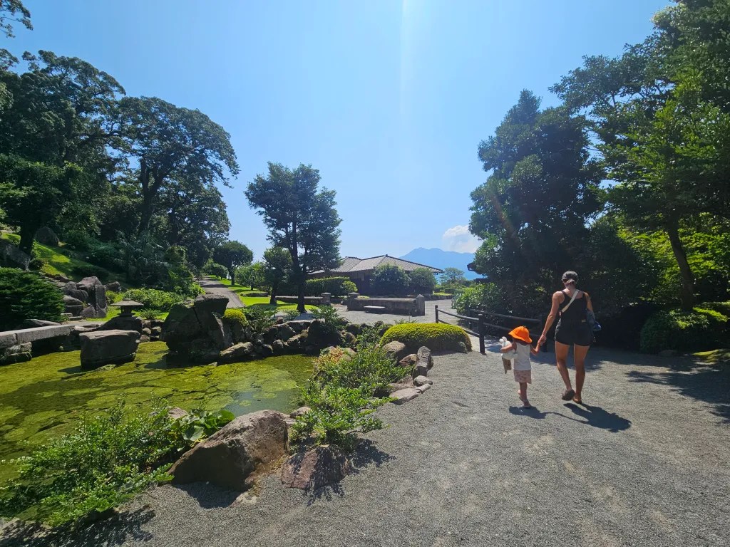 Encore une fois, nous avons complètement oublié les jours de la semaine. Nous mettons un certain temps à comprendre pourquoi la gare de Kagoshima est si vide alors que nous allons prendre le train. Evidemment, c’est samedi ! Nous montons dans un tout petit train pour Sengan-en, à seulement 10 minutes du centre-ville. On y trouve un des sites historiques incontournables de Kyushu, le jardin Sengan-en. Construit en 1658 par le clan Shimazu, ce magnifique jardin japonais abrite des plantes tropicales et offre une vue imprenable sur le volcan Sakurajima. La villa Goten, ancienne demeure du clan Shimazu, mérite également une visite pour comprendre le mode de vie de l’aristocratie locale. On y découvre que les rois de plusieurs pays dont Nicolas II de Russie et Edward III d’Angleterre ont visité cette maison typiquement japonaise et ont été épatés par son design et son confort.
