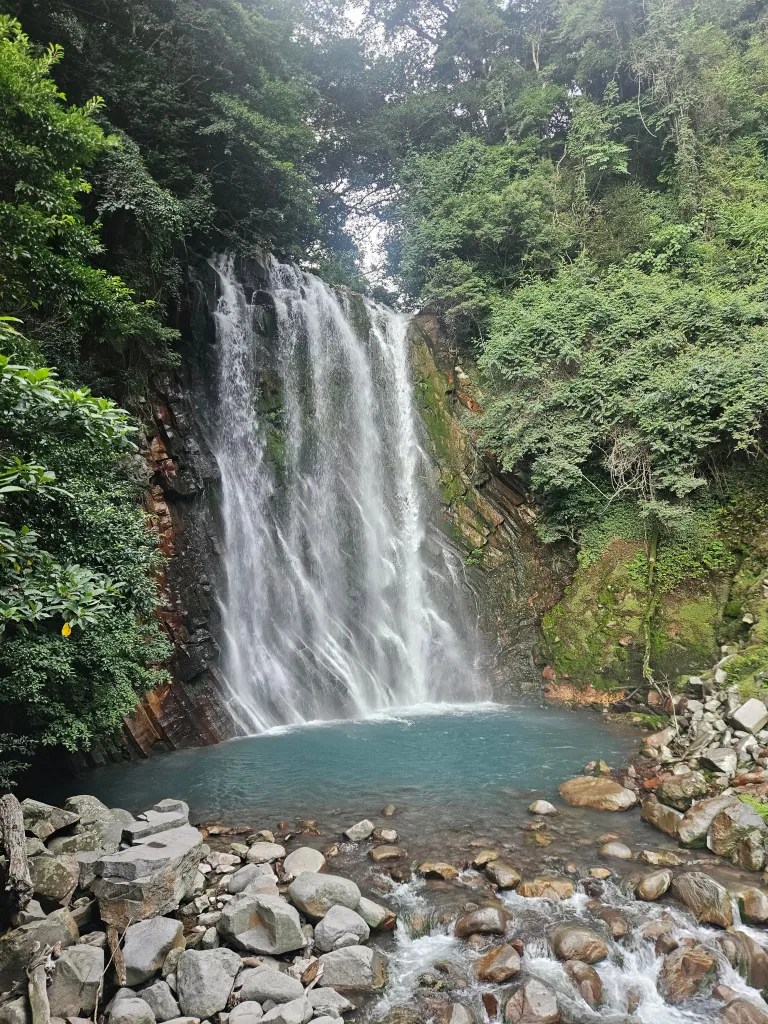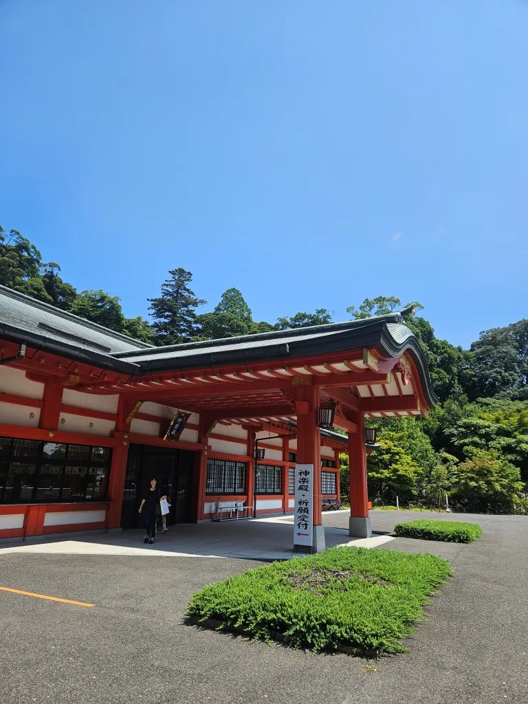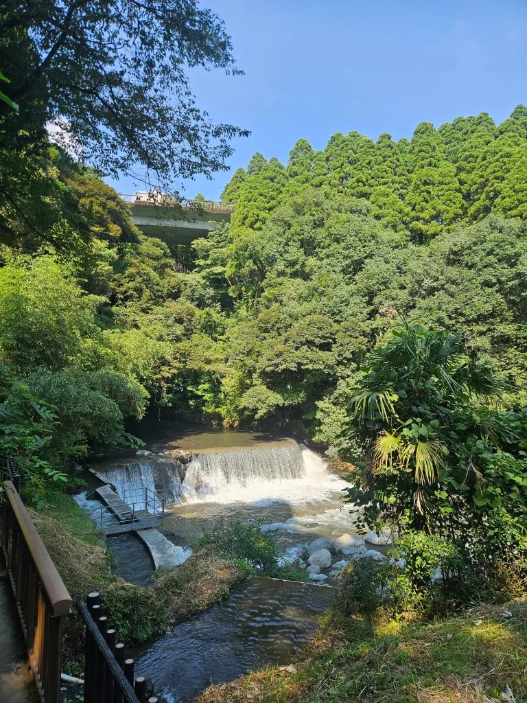 Arrivés au temple de Kirishima, nous descendons du taxi pour déposer nos bagages à l’auberge qui se trouve juste en face et où nous allons passer la nuit. Cela ne paye vraiment pas de mine, l’hôtel est très moche, les murs sont tous décrépis mais bon, cela ne veut pas dire que l’intérieur n’est pas correct. En Corée notamment, les chambres étaient souvent incroyablement propres et spacieuses alors que l’extérieur de l’hôtel ne donnait vraiment pas envie. On commence notre visite des alentours par le temple Kirishima-jingu, l’un des plus anciens sanctuaires shinto du Japon et l’un des plus visités. Il a une superbe façade rouge vif et des reliefs colorés détaillés, qui contrastent avec la nature verdoyante. Nous empruntons ensuite un petit sentier nature qui nous fait passer par de jolies cascades et des petites gorges avant de retourner à notre auberge pour nous installer.