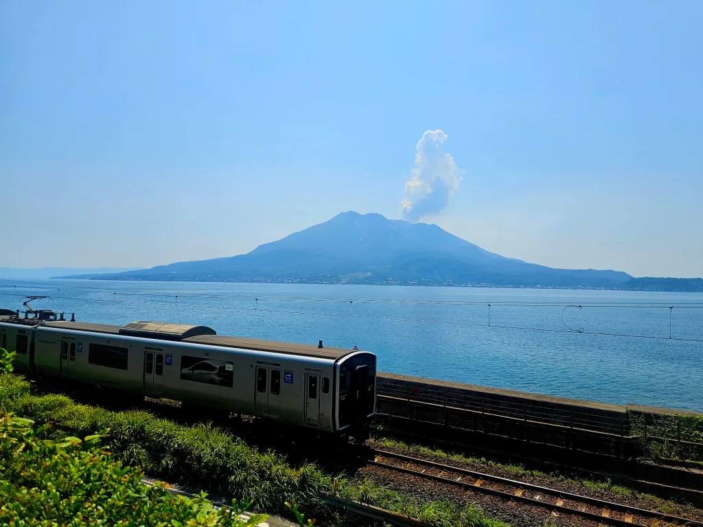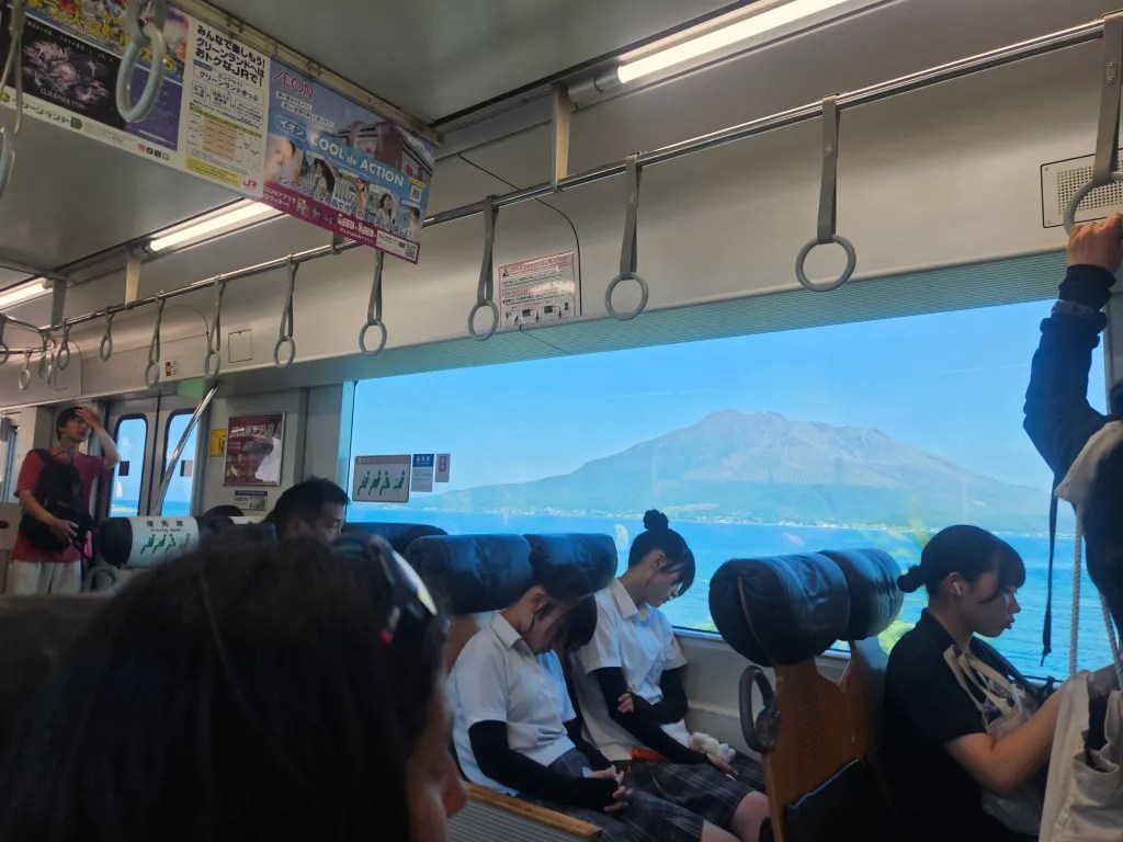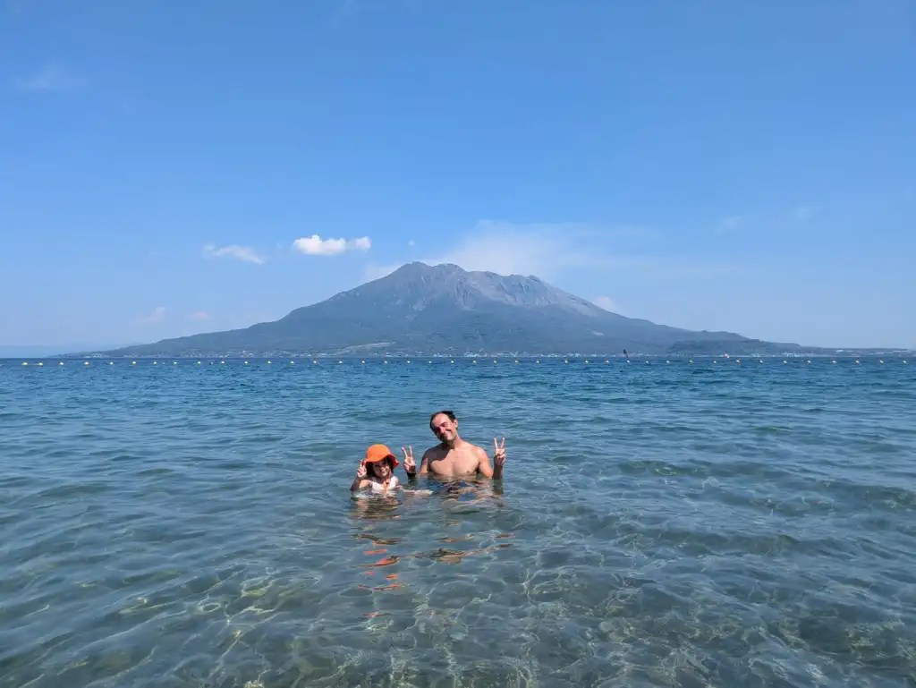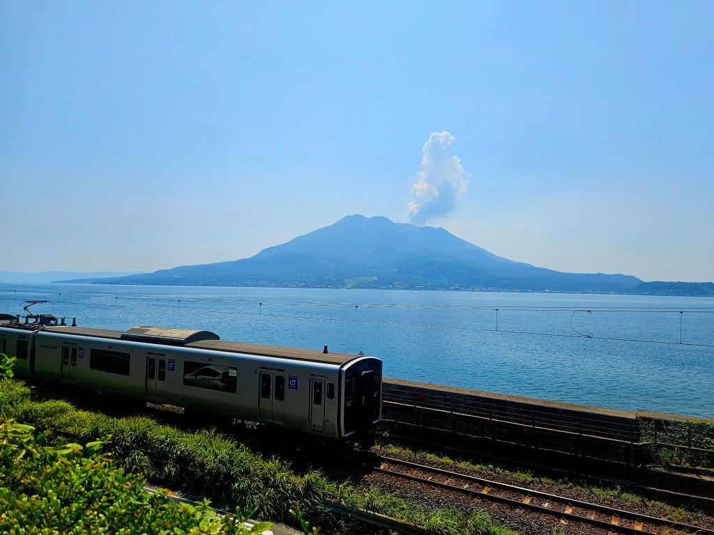 Nous sommes samedi et peu de trains circulent. Nous repartons à quinze heures pour éviter aussi d’être trop longtemps exposés au soleil. Pendant le goûter, nous cherchons nos étapes des prochains jours. On voudrait se rendre demain au nord de Kagoshima dans le parc national de Kirishima-Kinkō, le plus ancien parc national du Japon qui comprend plus de 20 volcans actifs aux formes diverses, ce qui lui vaut le surnom de « musée des volcans ». Mais, contrairement à la Corée, il est compliqué de se déplacer en transports au Japon quand on sort des grandes villes. Bien sûr, leur territoire est fantastiquement maillé par les trains entre les grandes métropoles (notamment sur l’île de Hunshu, donc pas là où nous sommes) mais dès qu’il s’agit de rallier un point isolé ou dans une zone moins peuplée, c’est tout de suite un casse-tête. Les bus sont peu fréquents, quand il y en a, et on se fait des nœuds au cerveau en se demandant si notre poussette sera tolérée à bord des bus. Au cours de ce voyage au Japon, nous avons perdu la sensation de liberté du voyage à vélo et on commence à ne plus s’amuser du tout.