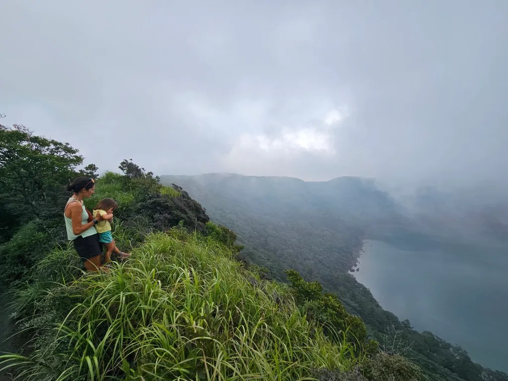 Il fait gris aujourd’hui, le ciel est bas, un contraste saisissant avec les jours de soleil éclatant que nous a réservé le Japon jusque là. Aux nuages se mêle la fumée pleine de souffre de l’eau bouillante des volcans. Nous arrivons à l’hôtel très tôt, nous y laissons notre attelage et nous repartons déjeuner en attendant le bus. Le parc national est le plus ancien du Japon mais il y a quatre bus par jour pour aller le visiter. En prenant en compte le retour, ça nous laisse trois heures pour nous balader. Nous grimpons un kilomètre de marches pour rejoindre le lac de volcan Onami-Ike. Clémence monte plus de la moitié toute seule avant de sauter dans le sac à dos.