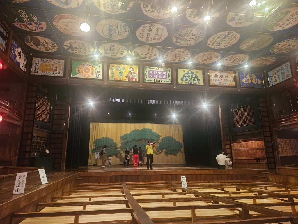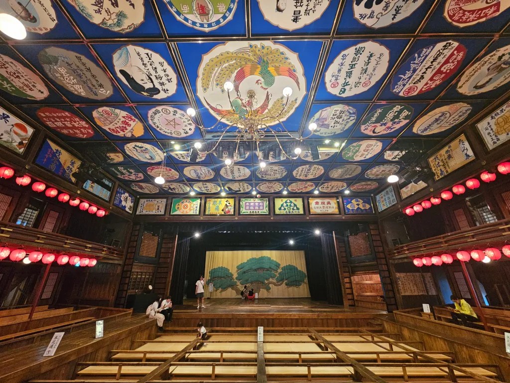 Le guide est fan de la France, qu’il a pu visiter à deux reprises, et nous prenons plusieurs photos ensemble avant de nous quitter. A quelques mètres de là, nous arrivons au théâtre Yachiyo-za qui est accessible aux visiteurs. D’une capacité de 700 personnes, la salle de spectacle est édifiée en 1910 par un riche marchand de Yamaga, dans le style des théâtres de Kabuki de la période Edo (17e – 19e siècles) L’aménagement du Yachiyo-za présente quelques particularités comme un box privé, 2 couloirs de part et d’autre de la scène ainsi que d’ingénieux souterrains pour l’époque. Dans les années ’70, le théâtre voit sa fréquentation baisser et commence à tomber en ruines. La population se mobilise pour le rénover complètement et l’inscrire comme Bien culturel important du Japon en 1988. Le résultat se montre à la hauteur des efforts fournis et l’on découvre un décor splendide, très coloré, à l’ambiance tamisée chaleureuse et qui sert de scène parfaite pour mettre en avant l’artisanat et le savoir-faire traditionnel de Yamaga.