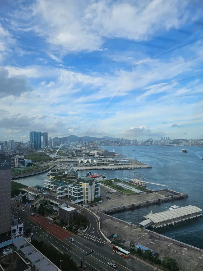 Quand nos colocataires du jour reviennent, nous migrons vers le salon panoramique à l’avant pour les laisser tranquille. Et après presque six heures de voyage monotone, nous distinguons enfin Busan se démarquer dans les collines au loin. L’excitation gagne l’ensemble des passagers qui commencent tous à s’affairer. Avec un seul escalier et un seul ascenseur, la sortie de tout ce petit monde n’est pas rapide mais efficace quand même. Nous passons les douanes comme à l’aéroport et nous récupérons nos vélos qui nous attendent sagement derrière. Tout ce processus nous aura tout de même pris presque une heure. Le temps de réinstaller nos sacoches et la remorque, nous sortons quasiment les derniers du terminal pour découvrir… qu’il pleut des hallebardes. Décidément, la pluie ne veut pas nous lâcher. On se sent maudits et on soupire à l’idée de devoir encore se retrouver à rouler là-dessous tout trempés. Par chance, elle se calme vite et quand nous actionnons les premiers coups de pédale, il pleut relativement peu.