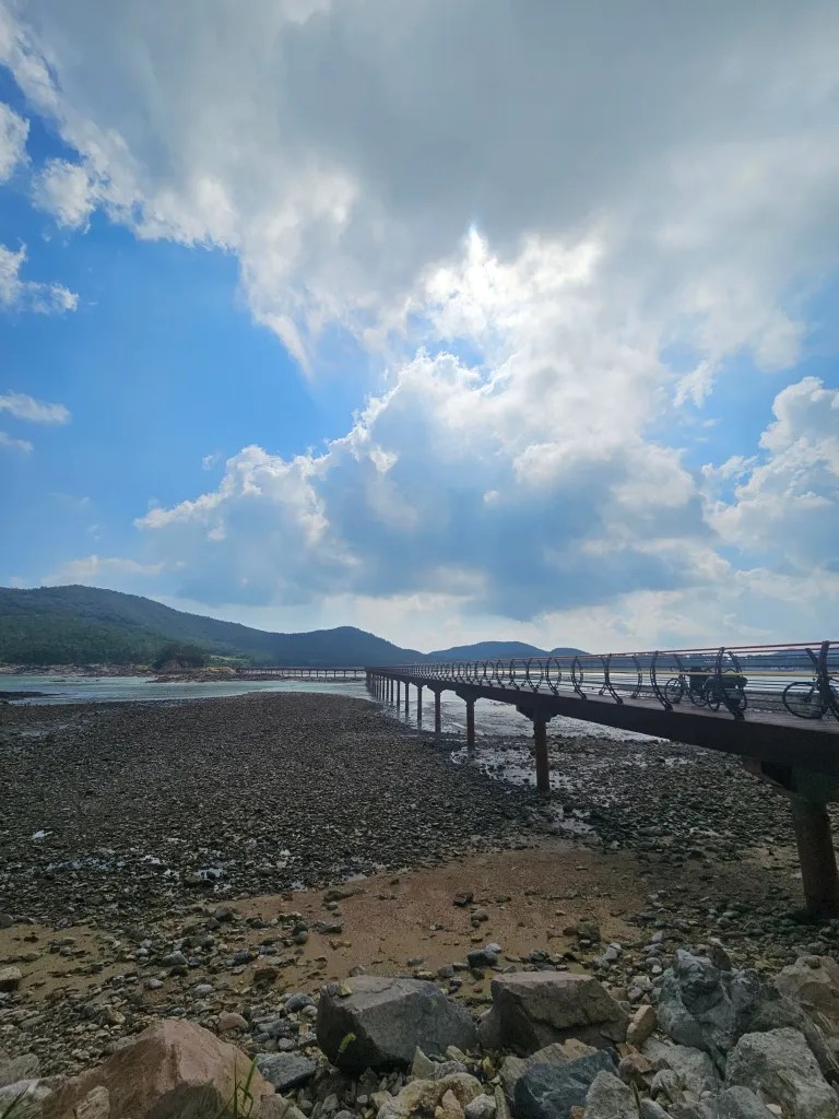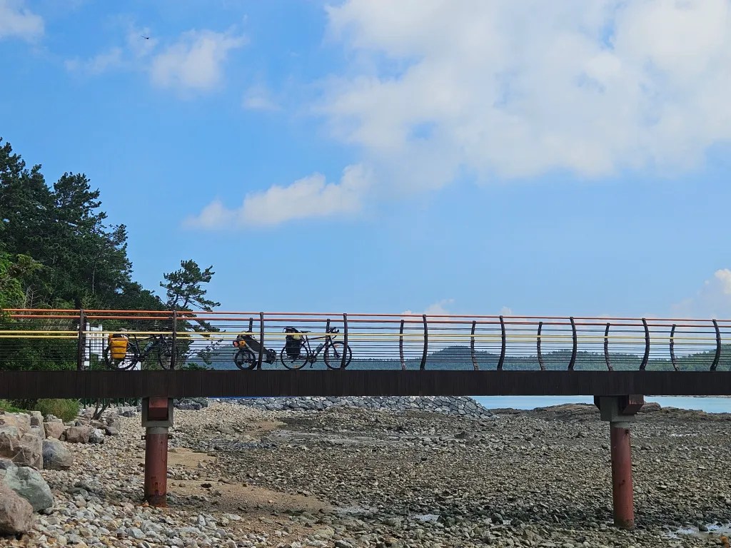 La route nous mène jusqu’au Ponte dell’Infinito, une gigantesque passerelle d’un kilomètre dont le nom est écrit partout en italien sans qu’on arrive à savoir pourquoi. Est-ce que l’architecte était italien ? Est-ce que les coréens trouvaient ça classe ? On ne saura sûrement jamais. On va quand même jusqu’au bout sur nos vélos et l’on trouve un joli paysage et un vieux monsieur endormi dans sa gargote qui vend des boissons et des snacks. Plus que 4 kilomètres nous séparent du terminal du ferry et nous sommes encore largement dans les temps. Nous empruntons un itinéraire qui se révèle être un véritable cauchemar pour un cyclotouriste ou un cycliste route : une route en cailloux. Parfois, les applis GPS voient des routes qui n’en sont pas mais on ne peut le découvrir qu’en étant dessus. Après toutes nos mésaventures avec les différents pneus, nous préférons descendre de vélo et pousser jusqu’à retrouver la douceur du bitume.