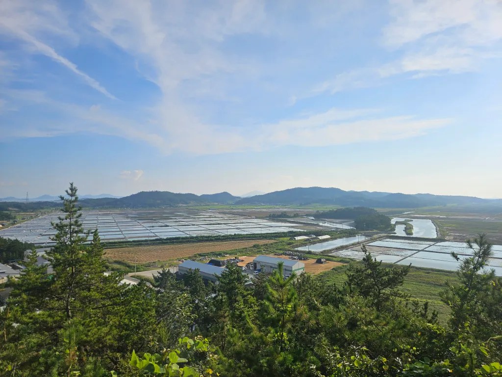 On se réveille en douceur ce matin car le temps ne presse pas. Nous avons certes un ferry à attraper à 11h40 mais il n’est qu’à une dizaine de kilomètres et nous avons donc le temps de voir venir. Après un petit-déjeuner banal, nous prenons la route à toute lenteur pour apprécier les paysages. Nous sommes dans la campagne rurale la plus profonde, autour de nous des rizières et des plantations d’oignons à perte de vue. La route sinue à travers des micro-villages où le peu de personnes qu’on croise nous gratifie toujours d’un signe de tête ou d’un petit coucou de la main. Les conducteurs coréens sont toujours aussi prudents avec les cyclistes et il se dégage une impression de calme et de bout du monde sur cet archipel de confettis d’îles.