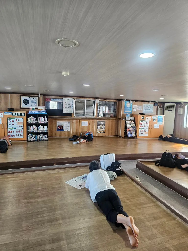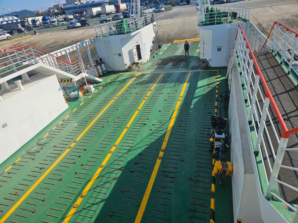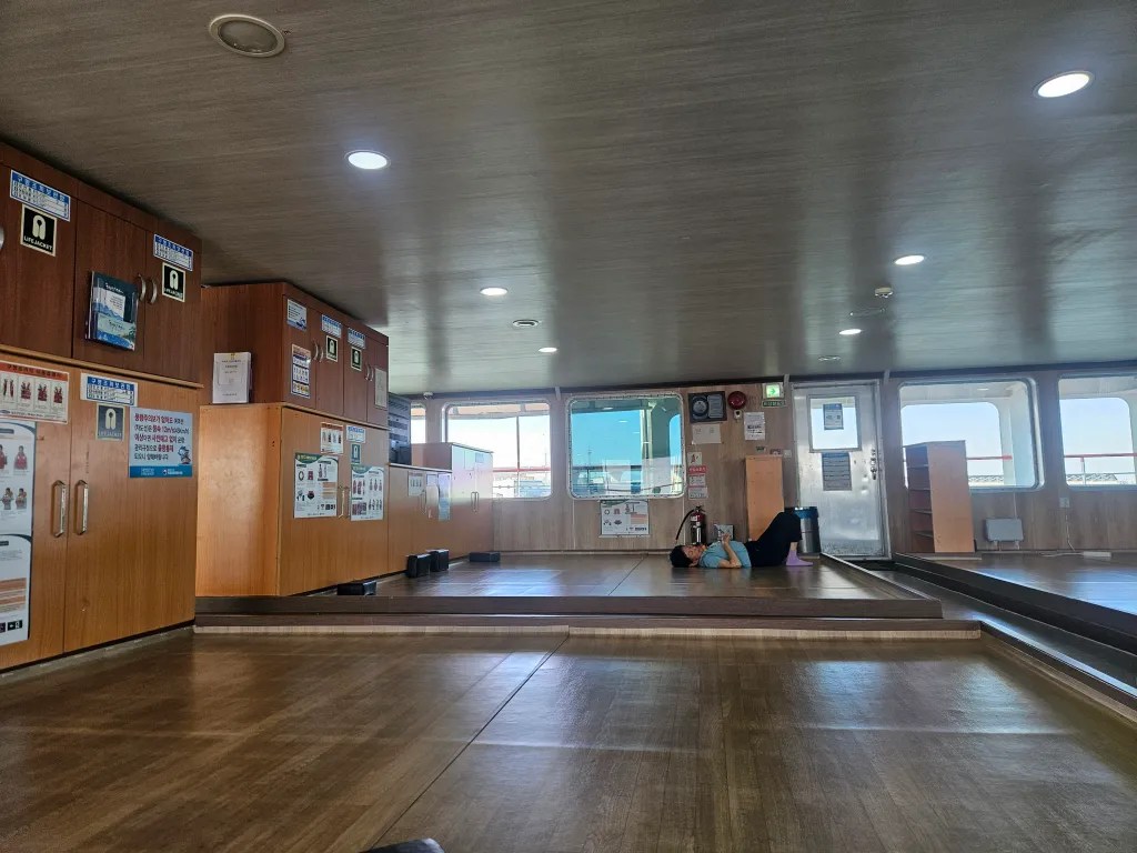 Nous sommes un peu en avance au terminal des ferrys mais ça nous permet de nous rafraichir. Le port est désert, seule une petite salle propose une climatisation et une fontaine à eau. On ne se fait pas prier pour profiter des deux en patientant. Les autres passagers du bateau sont étonnés de nous voir avec nos vélos et ils nous parlent en coréen d’un ton très impressionné. Quand les locaux nous parlent, nous leur répondons deux choses en général : France et trois ans, parce qu’on présume qu’ils veulent savoir d’où l’on vient et l’âge de Clémence. Mais ils nous demandent peut-être la marque de notre vélo ou notre profession, ce à quoi nos réponses tombent à l’eau.